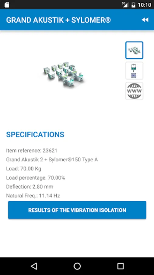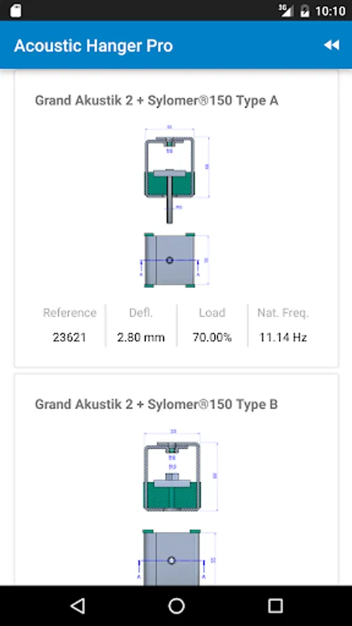 The acoustic hangers included on Acoustic Hanger Pro are manufactured by AMC-MECANOCAUCHO™. With this app you can choose to make vibration calculations using Sylomer®, rubber or spring based solutions. This feature allows you to filter the acoustic hangers specifically on the elastic material that is used.