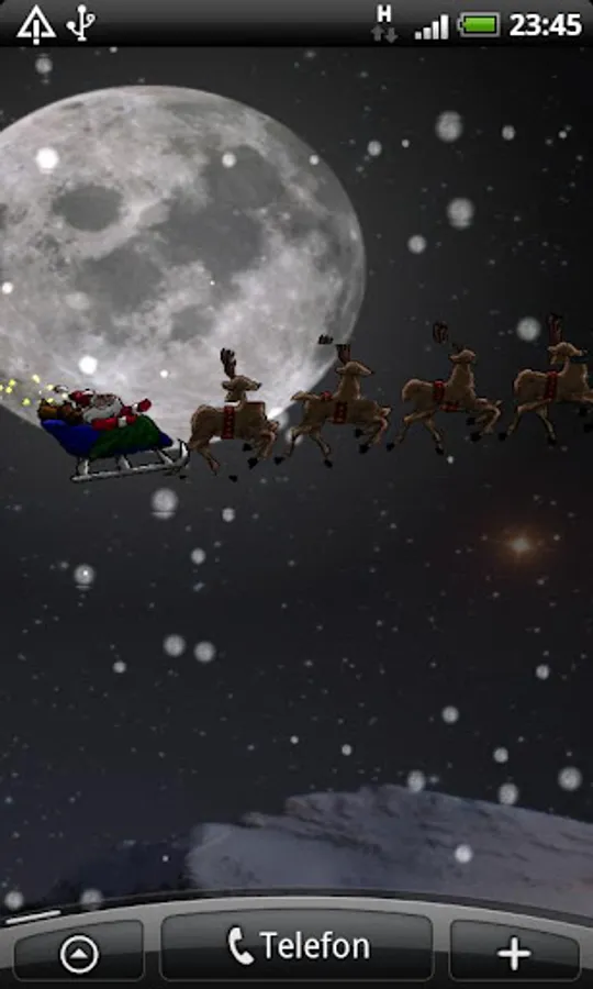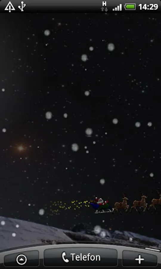 Shows Santa riding his sleigh in a beautiful night sky with snowflakes falling!