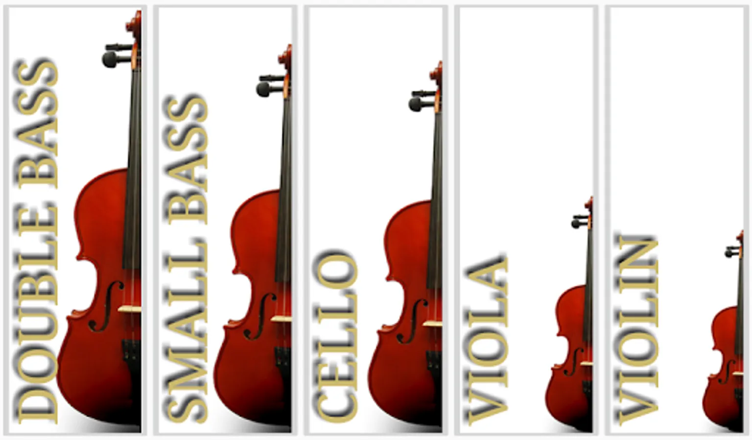 • 5 Instruments: Violin, Viola, Cello, Small Bass, Double Bass.