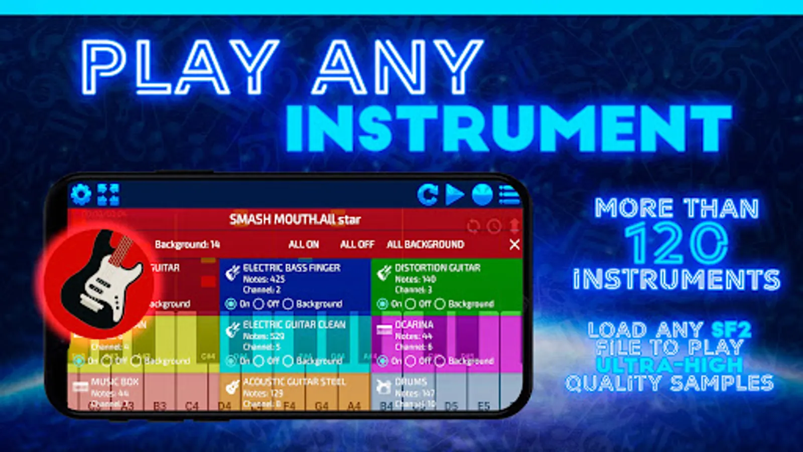 • Load any SF2 File to play with custom instrument samples