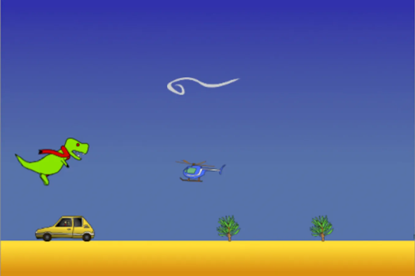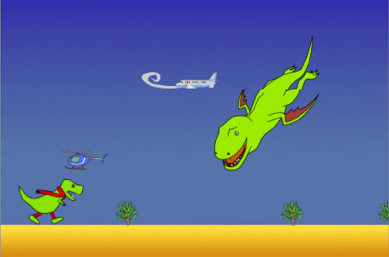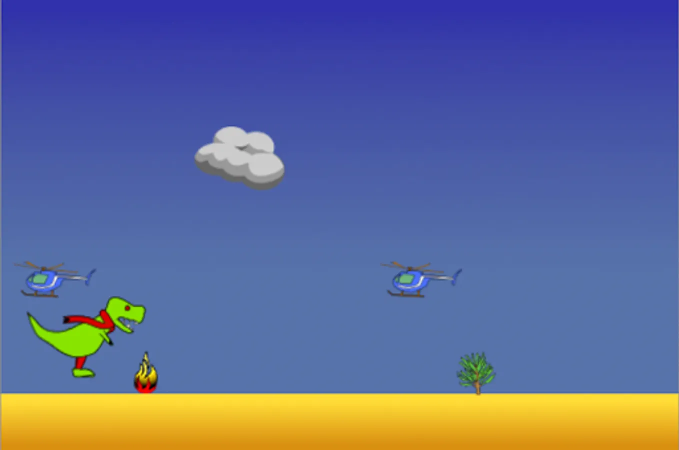 This is the dinosaur parkour game! Use a single finger to make the dinosaur jump, to avoid obstacles. Trees, cars, helicopters, fire, and the giant dinosaur can be avoided either by jumping on top of them, or by quickly running below them.
