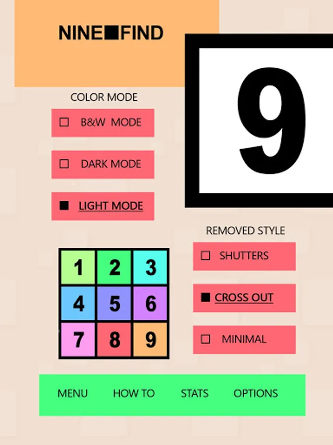 Welcome to NineFind, where most numbers are wrong and it's your job to find which nine are correct! Unlike most number puzzles that start with empty white squares, NineFind starts with a grid of numbers filled in. To find the nine correct numbers, you'll use logic and simple addition to remove numbers that must be wrong. With intuitive controls and increasingly difficult puzzles, work your way through 5 levels of difficulty and endless challenges.