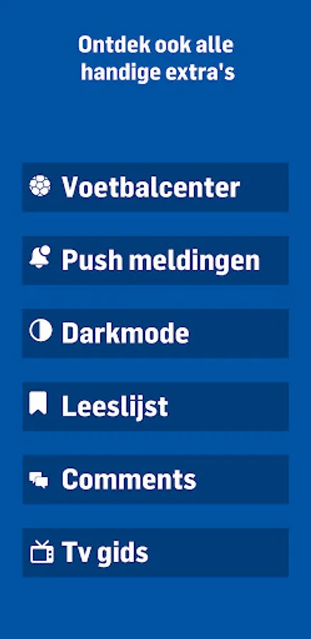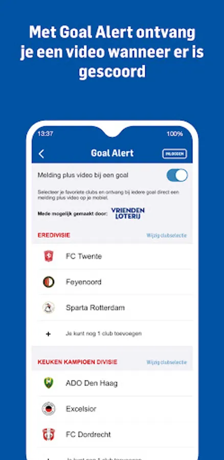 * Also sign up for Goal Alert! Does your favorite club score in the Eredivisie, Kitchen Champion Division or Toto KNVB Cup? Then you will immediately receive a free video of the goal on your mobile.