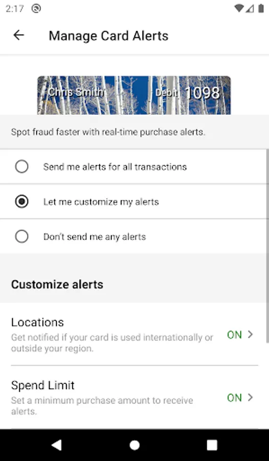 Alerts for PIN and signature transactions can be set up to keep you informed of your debit and credit card usage and help you quickly detect unauthorized or fraudulent activity. This app can send an alert when a card is used or when a card transaction has been attempted but is declined – and additional customizable alert options are available. Alerts are sent in real time, immediately after a transaction has taken place.