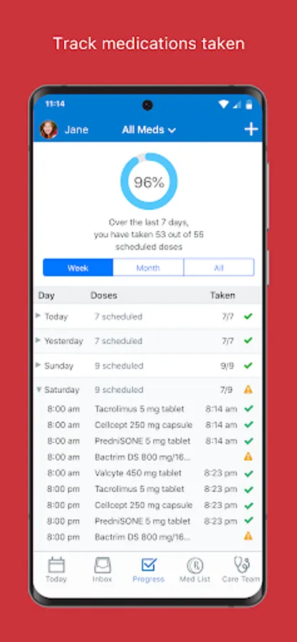 We keep track of doses you mark taken so you can see how well you adhere to your medication schedule. If you are connected to a healthcare provider via MedActionPlan PRO, your provider will be able to follow your progress too.