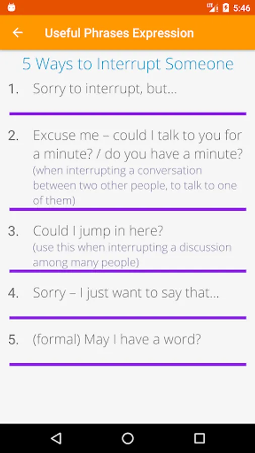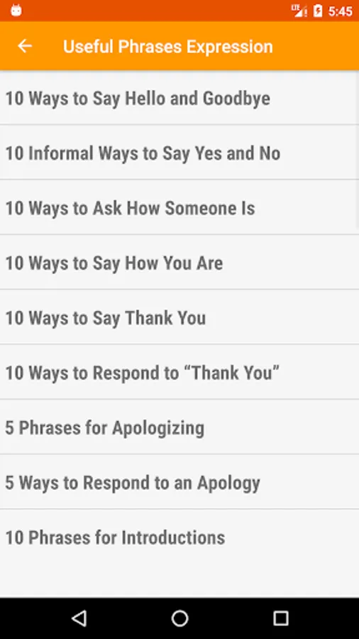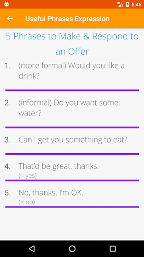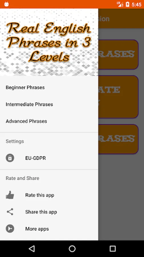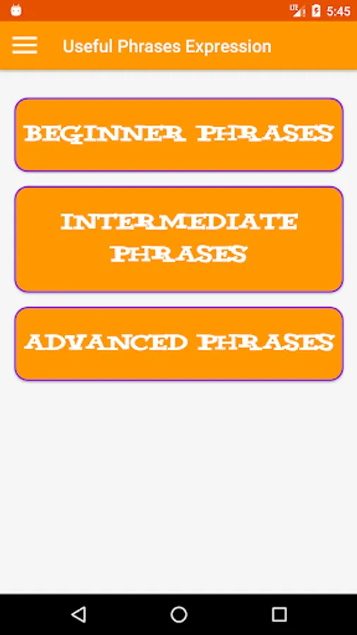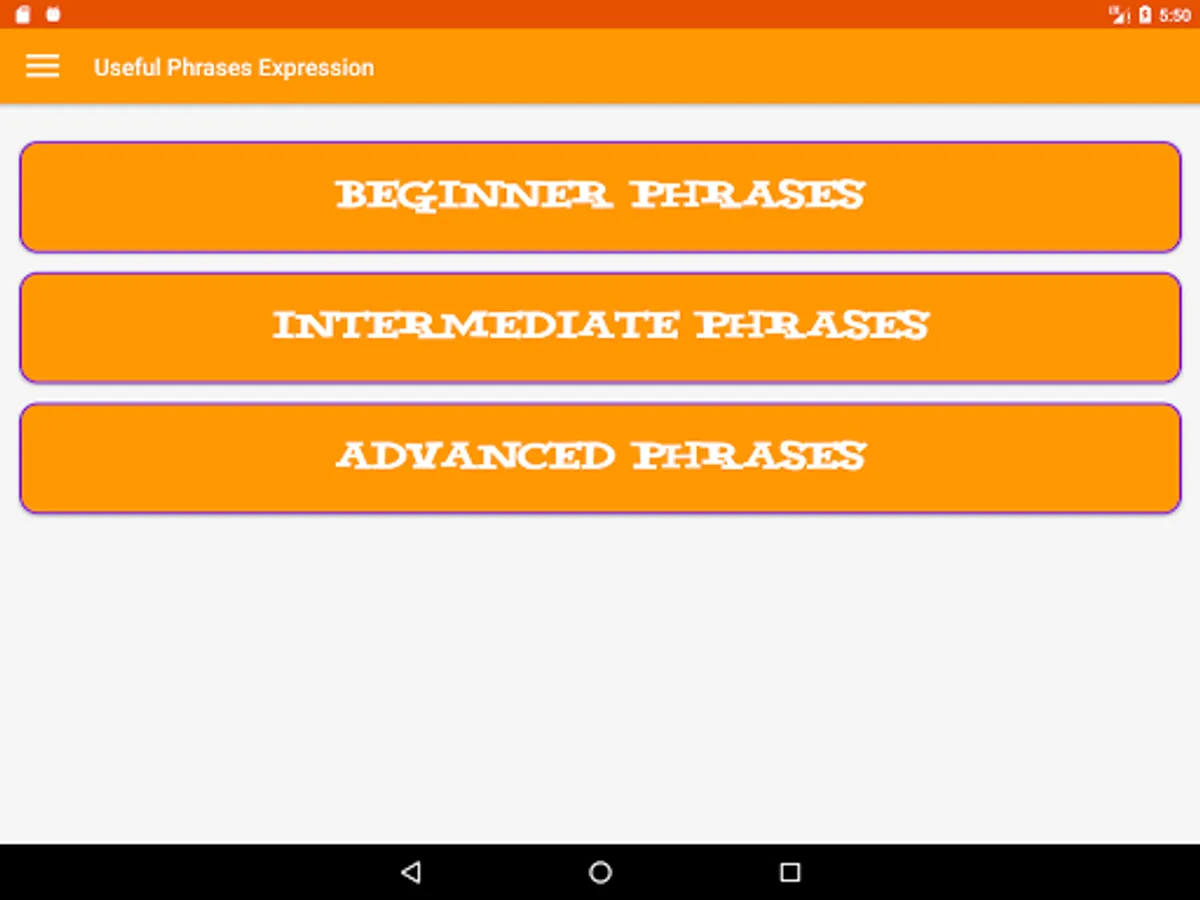 The goal of this app, Useful English Phrases, is to teach you English phrases in 3 different levels: Beginner Phrases, Intermediate Phrases and Advanced Phrases.
