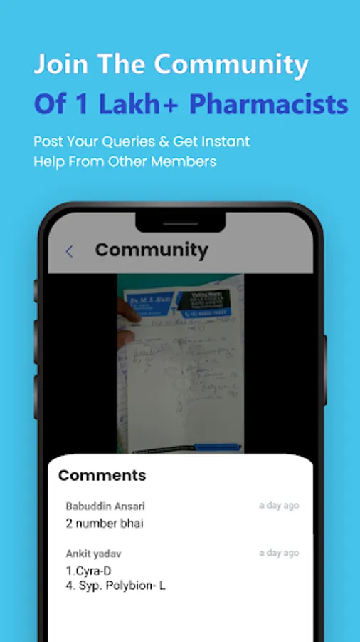 Community Feature: Join the most exclusive community for chemist & medical store people. Connect with chemists all over India, ask your queries and share your experience in the community.