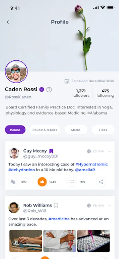 During the sign up, after verifying your professional credentials, the platform lets you create a profile, add a photo and a short bios. You can start following the peers from your profession. Similarly, other users can follow you.