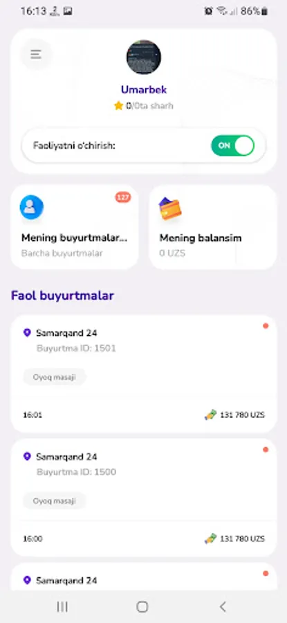 Ilovada mijozlardan kelgan buyurtmalarni qabul qilish orqali pul ishlang va ularni kartangizga chiqarib oling