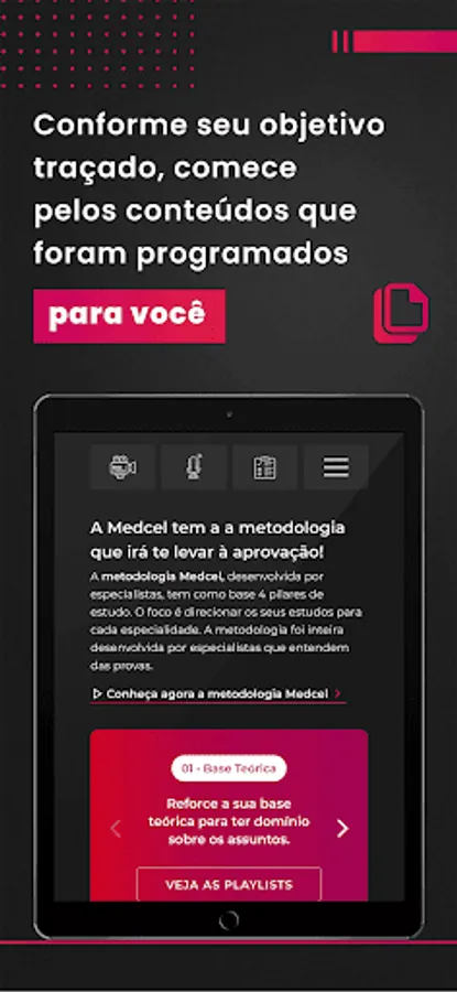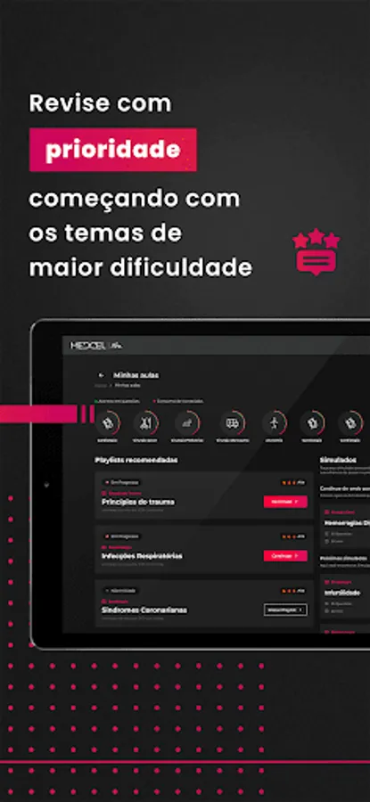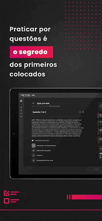 Use the Medcel app to watch video lessons, listen to podcasts and read book chapters prepared by the best professors and specialists in the market. Access the collection with more than 30,000 commented questions to take tests and simulations, comparing your performance with other students who are taking the same tests as you.