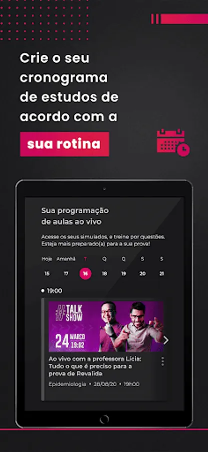 To answer your questions directly with the professors, discuss clinical cases and get valuable study tips, an exclusive schedule of live classes is offered for your course. Don't miss it and always be up to date and keeping an eye on the evidence!