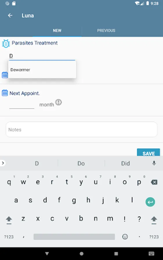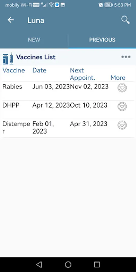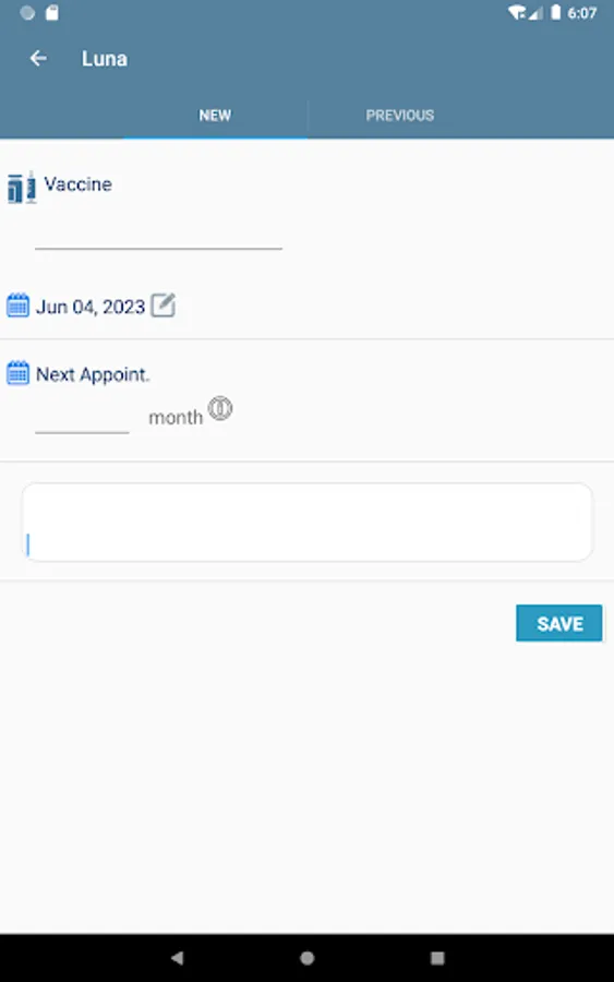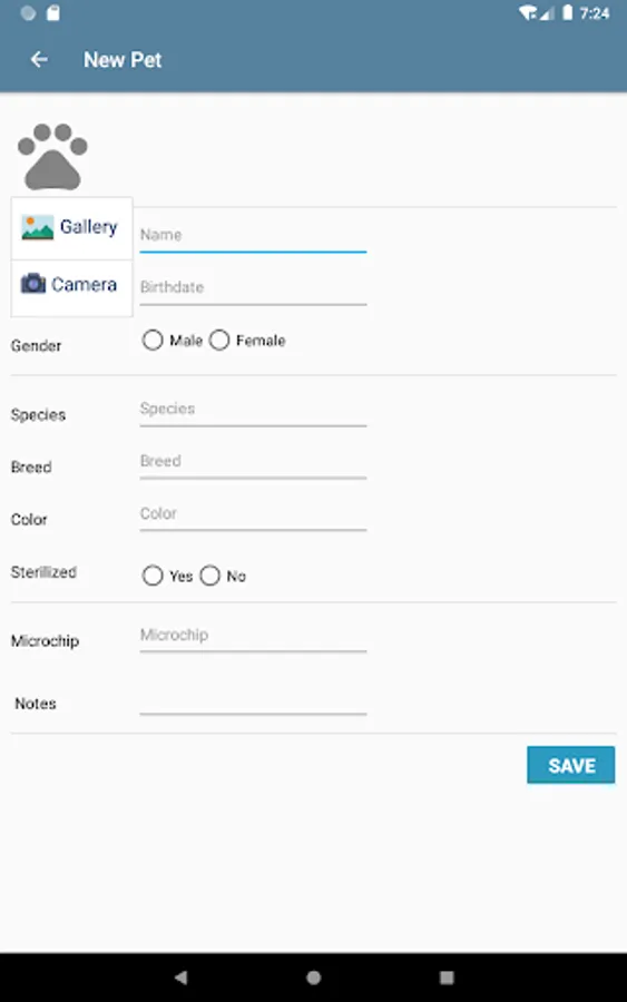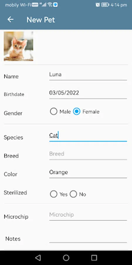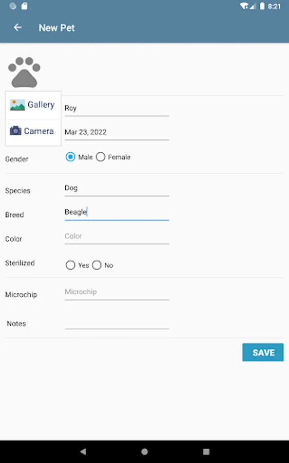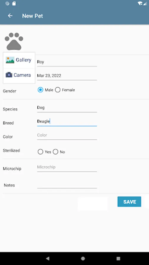 The app enables you to save all the needed information about your pet like breed, color, sterilized or not and microchip number. You can add multiple pets data,
