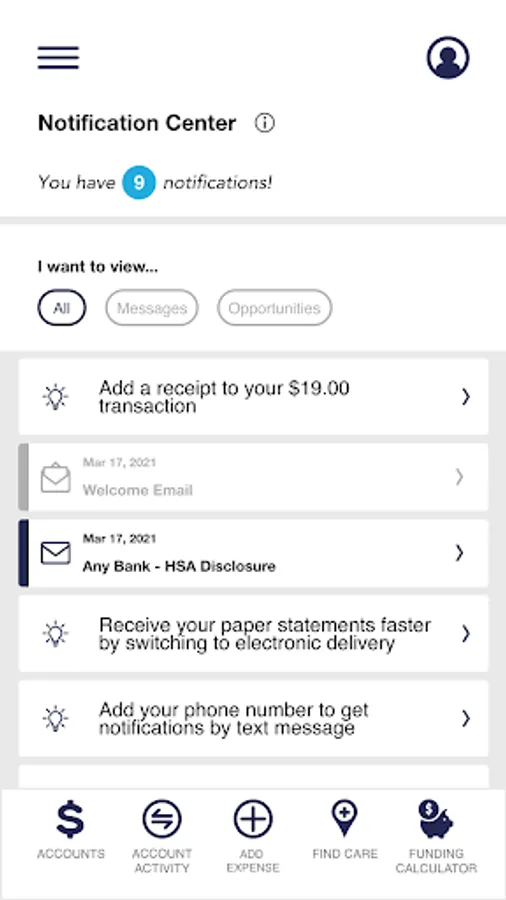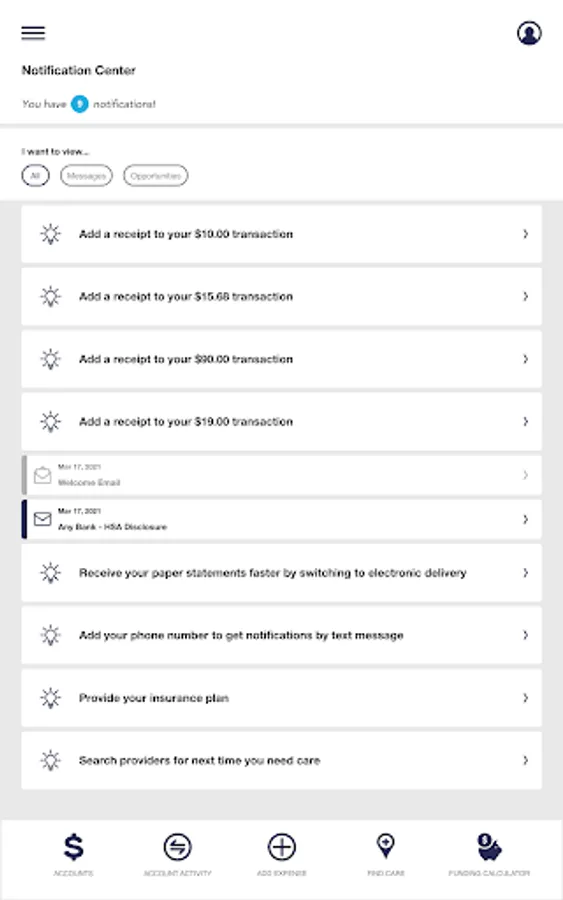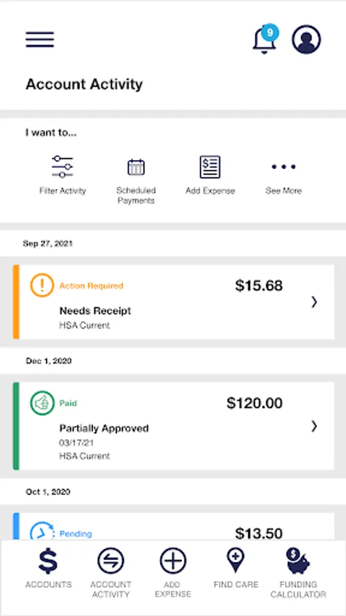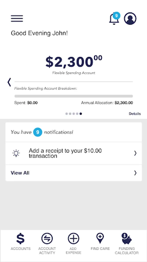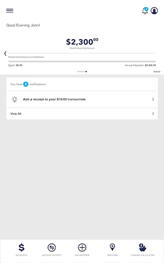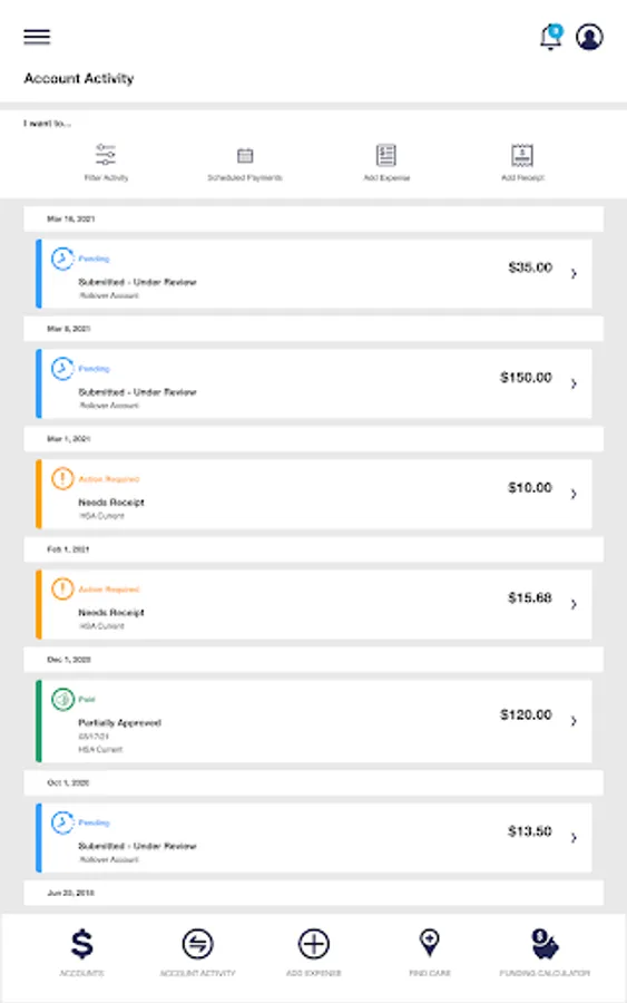 View all of your benefit account(s) recent transactions, balances, election information, claims filing deadlines, and more. You may also view transactions that require receipt documentation that may need to be submitted.