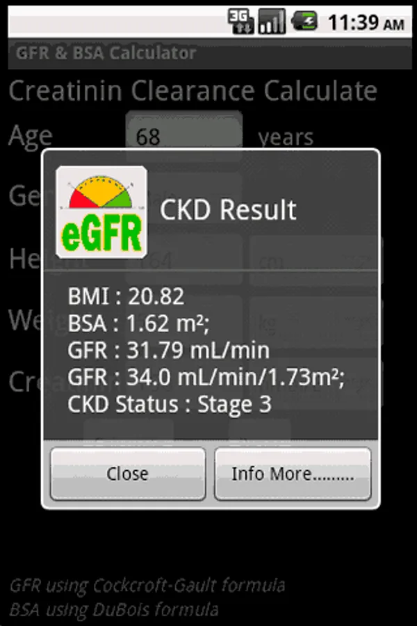 Software use Cockcroft-Gault (for GFR) and the DuBois formula (for BSA) to show value in mL/min/1.73m2. It be recommend by NKF's KDOQI clinical practice guidelines to estimate GFR.