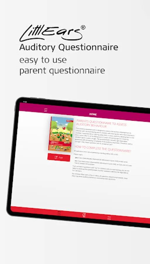 LittlEARS® Auditory Questionnaire (LEAQ) is a parent questionnaire to assess auditory development in children with normal hearing and children with a hearing loss who received Cochlear Implant(s) or Hearing Aid(s). It covers auditory development milestones in the first two years after receiving the hearing devices or in hearing children, up to two years of age. The LEAQ includes age-dependent questions that increase in complexity. Therefore, the older the child, the more auditory behaviors that would be expected to be observed by the parents.