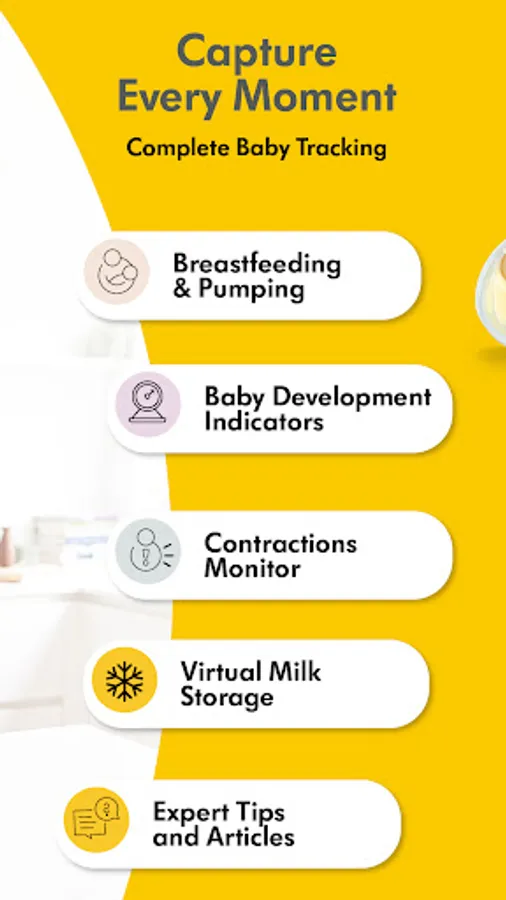 After your breast pumping session, you can add the milk to the virtual milk storage feature to keep an overview of your milk stash.* Monitor lactation, baby development, sleep, and more.