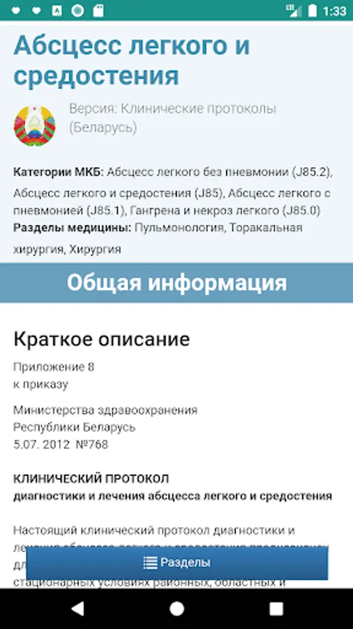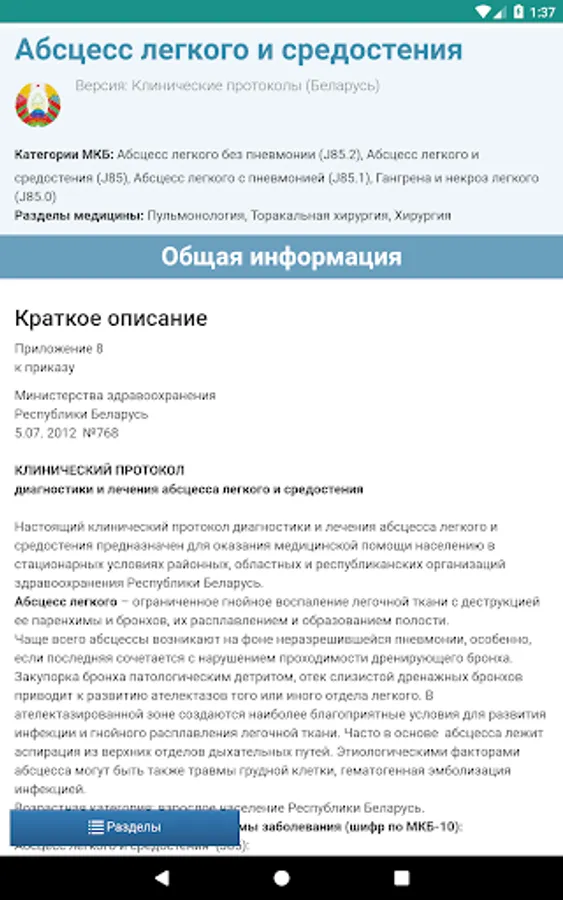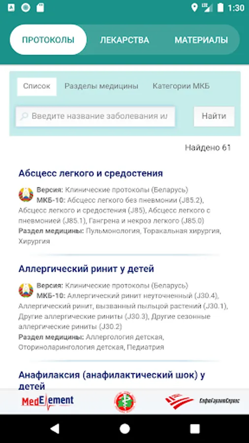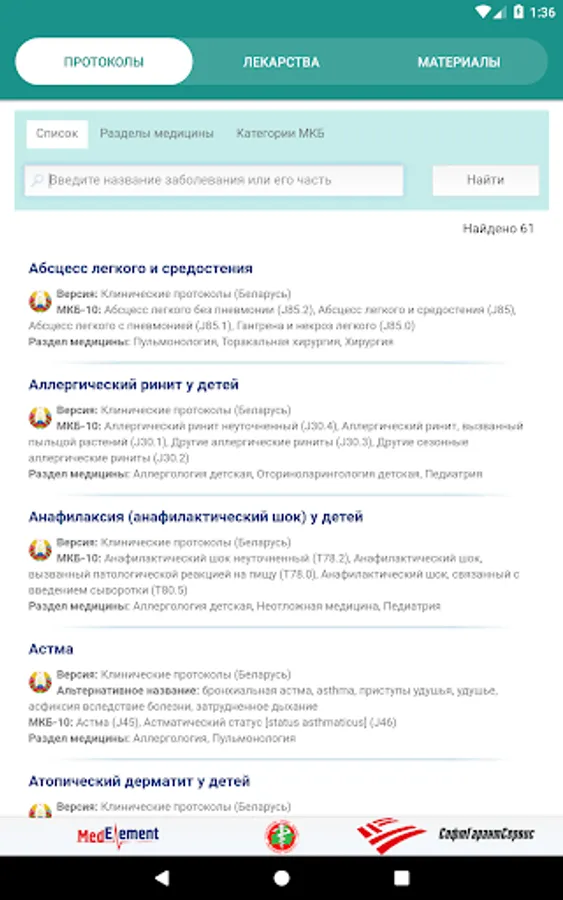 The application contains a complete database of clinical protocols for diagnosis and treatment of the Ministry of Health of the Republic of Belarus, as well as a directory of medicines and information and reference materials for doctors.