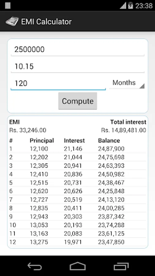 A simple yet effective calculator to compute easy monthly installment (EMI) of your home, car or personal loan. Use this free app to get EMI split between principal and interest as well as the monthly balance.