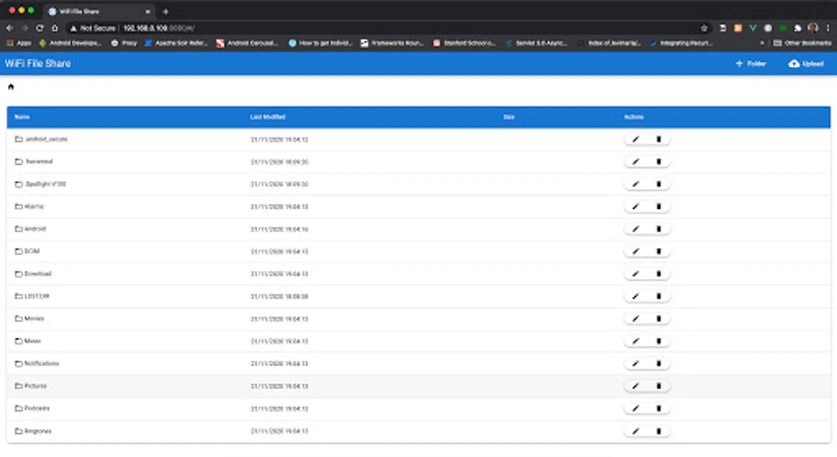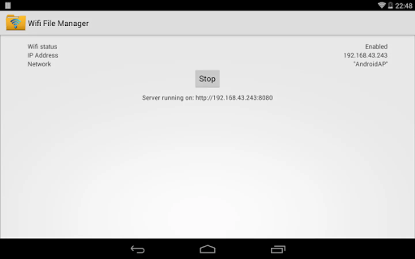 A simple and easy use app to manage files on your android device over wifi. Avoid using USB cables to transfer files, movies, photos and songs from your device to laptops/PCs/Macs and other android devices.