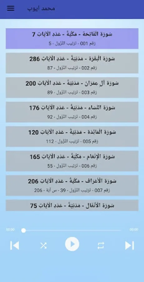 واجهة تطبيق القرآن الكريم بصوت محمد ايوب بسيطة جدا وسهل الاستخدام