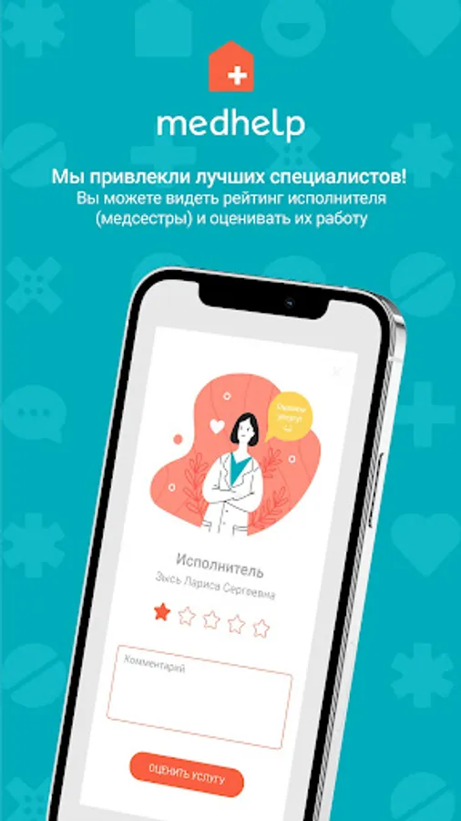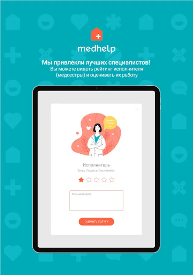 You can select services from the list and pay for them with a non-cash payment method, see the rating of the performer (nurse) and evaluate their work. We have attracted the best specialists!