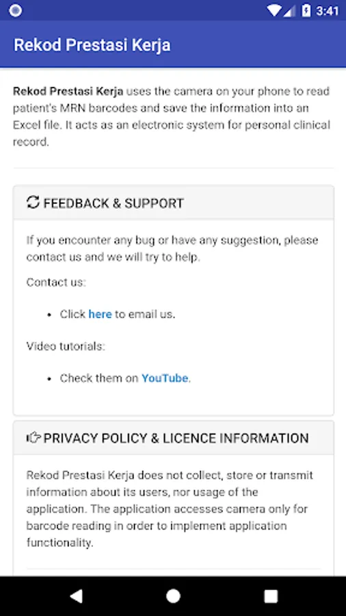 It uses the camera on your phone to read patient's MRN barcodes and save the information into an Excel file. It acts as an electronic system for personal clinical record.