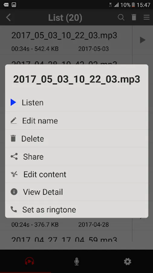- send/share a recording via email, sms, mms, facebook, whatsapp, dropbox, etc.