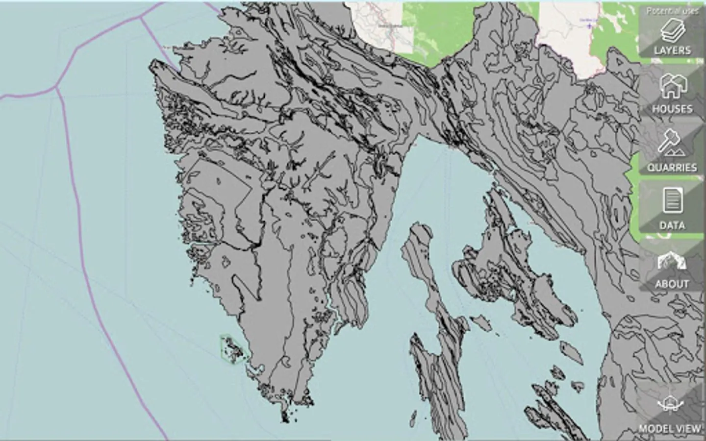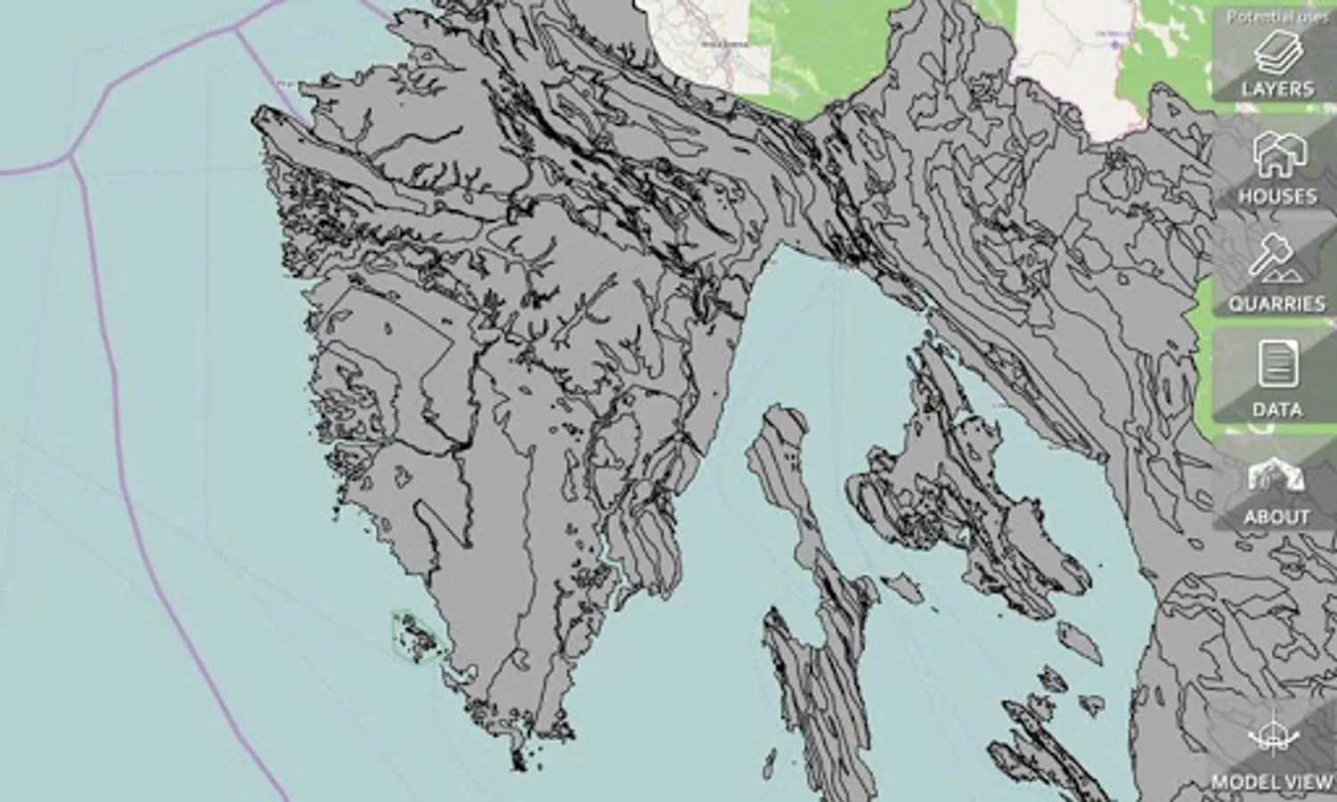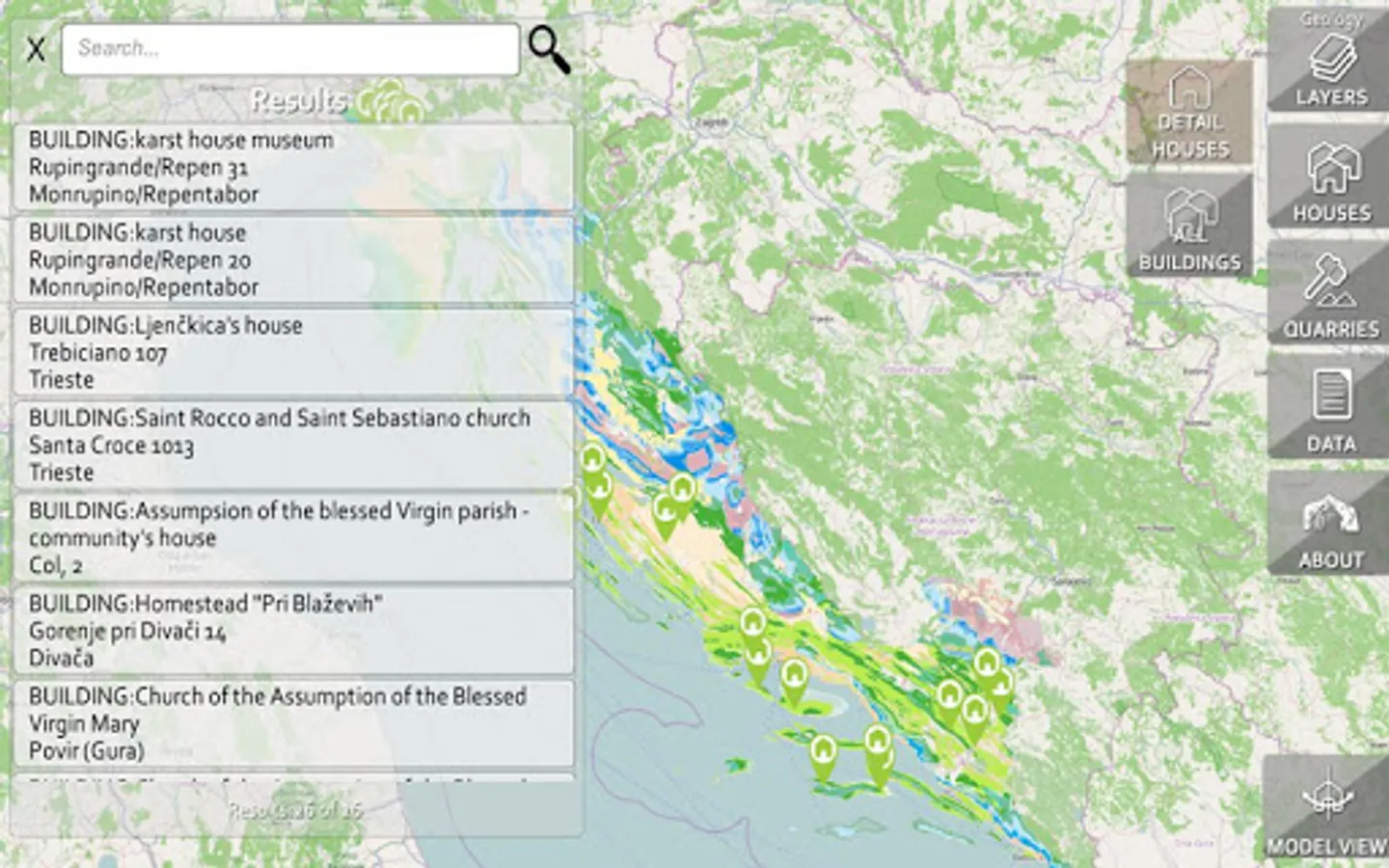 The RoofOfRock application enables users to explore geological data, map layers, locations of houses and quarries and view selected 3D models of houses along with connected house elements made of platy limestone – limestone that was used to cover roofs, and construct dry walls, shepherd's cottages (kažuni) and similar objects of cultural heritage. Some of the most interesting buildings in the area extending from Trieste to Dubrovnik were selected in order to best present limestone as an important element of cultural heritage. Platy limestones are also important as natural heritage, exhibiting diverse fossil fauna as well as rare, well-preserved vertebrate fossils.