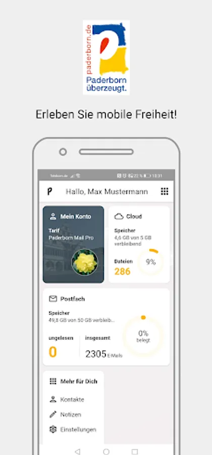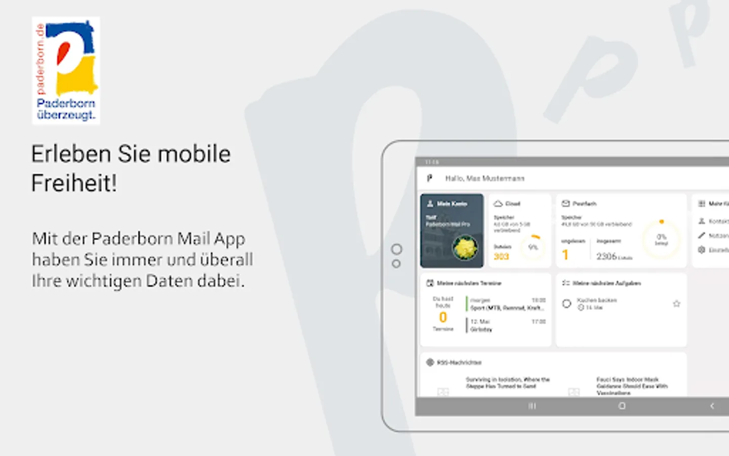 Your city - your Paderborn Mail - your app! Experience mobile freedom and show your love for Paderborn. With the practical and, above all, secure app for smartphones and tablets, you always have access to your e-mails, photos, videos and important documents, even when you're on the go.