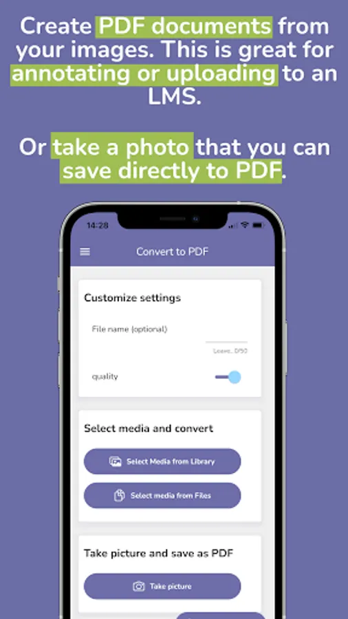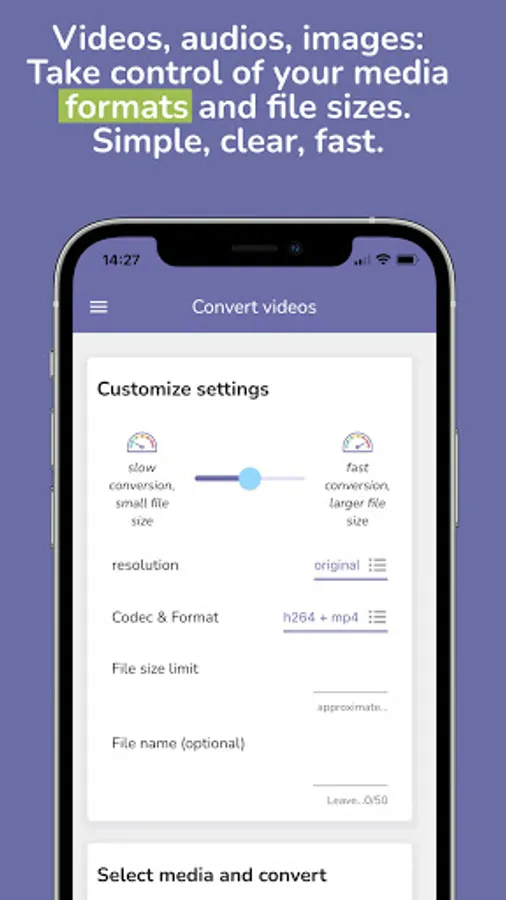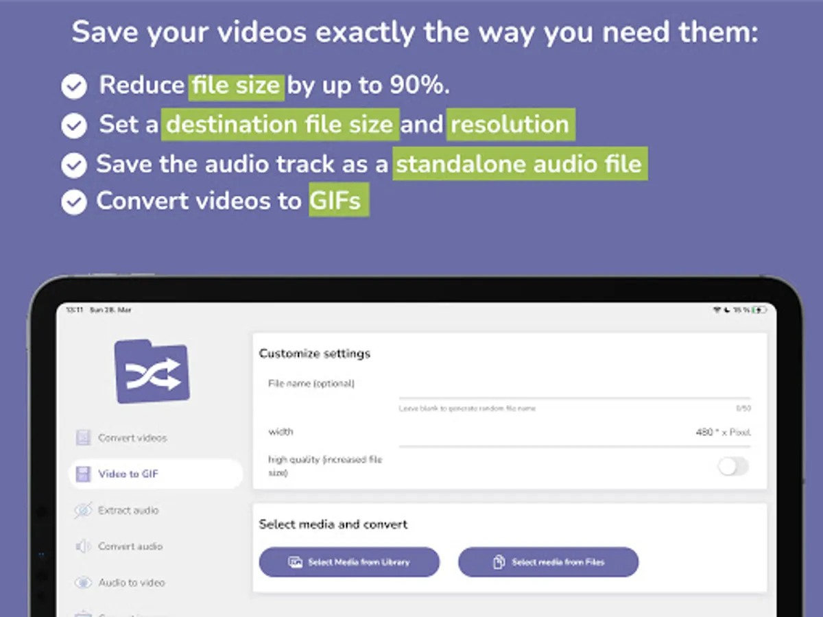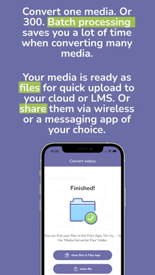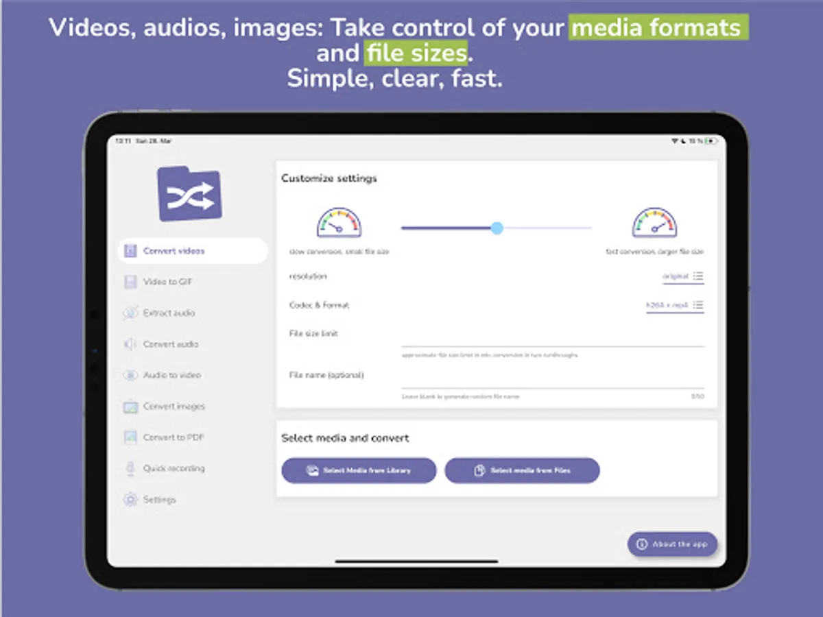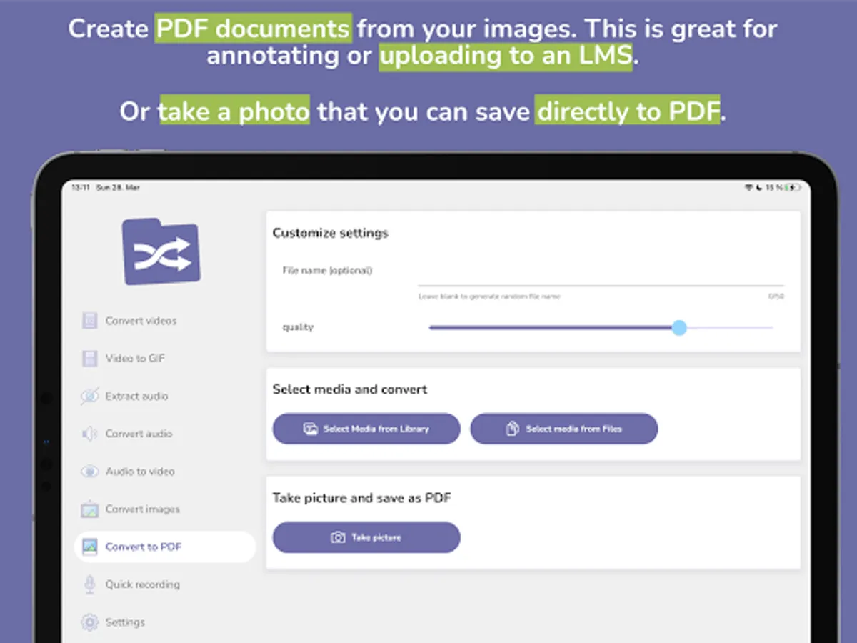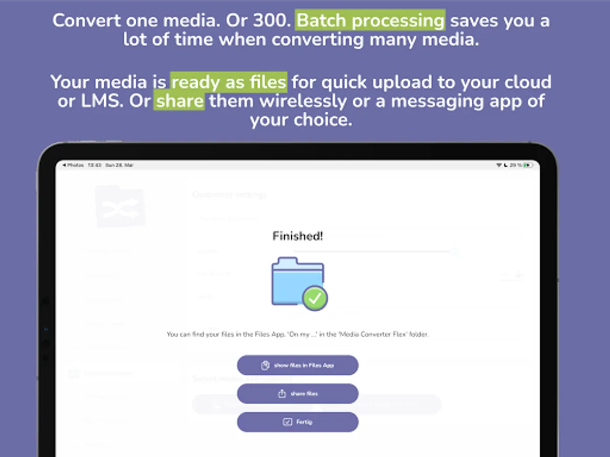The app converts your media such as videos, images and audio files: reduce file sizes and convert them to popular formats compatible with any device and learning platforms like moodle (mebis):