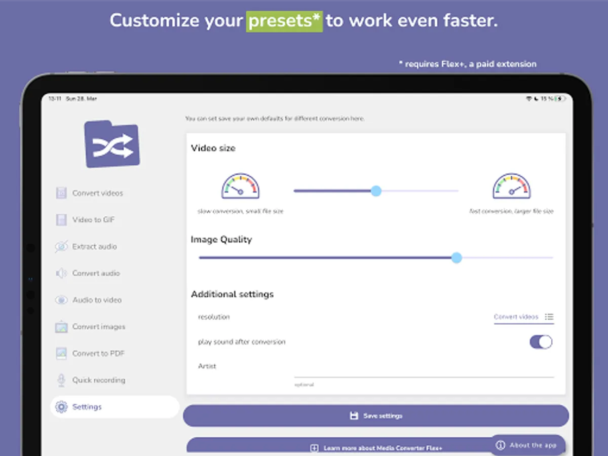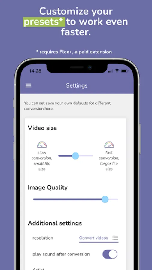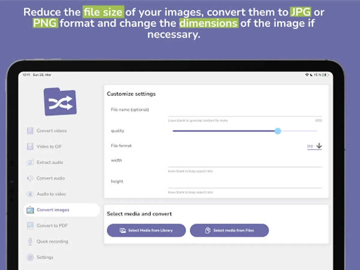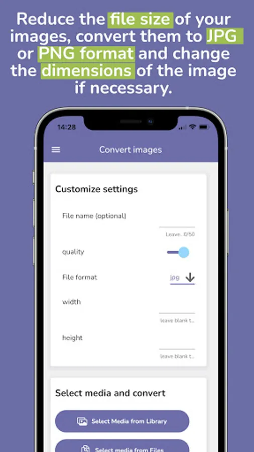 Reducing image quality often has little to no visible effect on your images. However, just a small reduction often makes a big difference in the file size of your images. Convert up to 300 images at once with the app and use a familiar simple slider to adjust image quality.