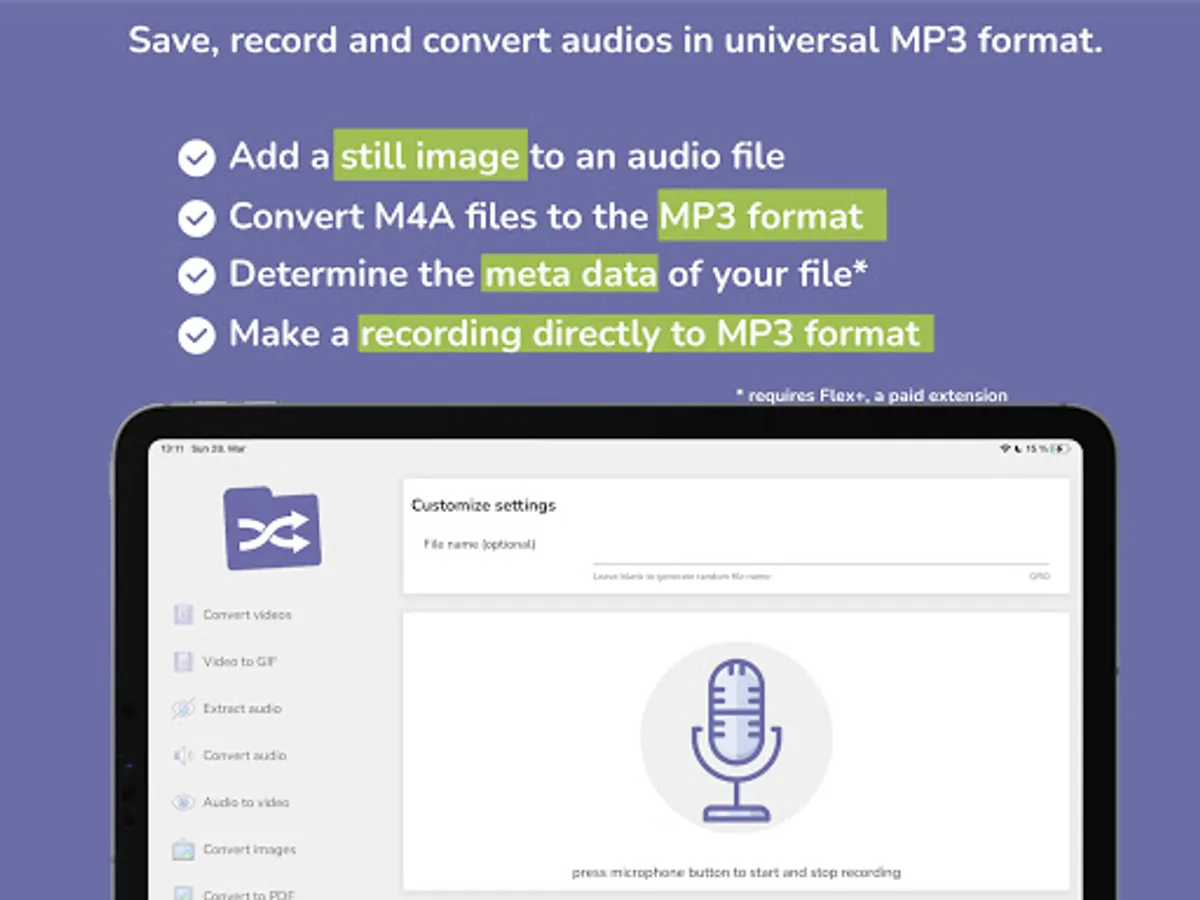 To make voice recordings and other audio files more compatible with other devices and platforms, convert audio files to MP3 within seconds. Or record voice memos and sounds with the built-in recorder and save them in MP3 format right away. This is handy for recordings you want to share. No need to convert.