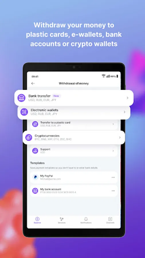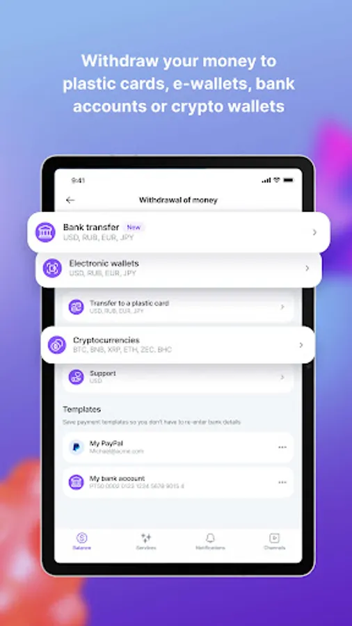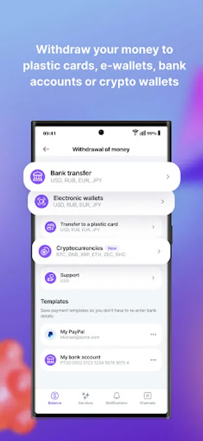 Bank Transfer, E-wallet, Transfer to a plastic card - choose the method and currency that suit you.