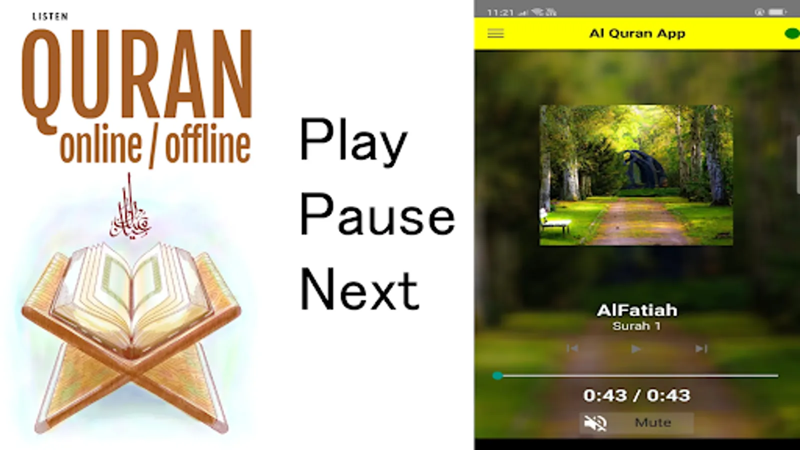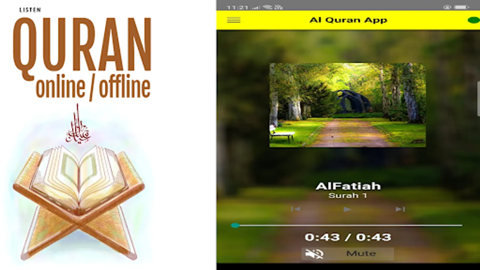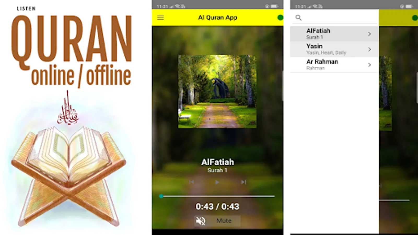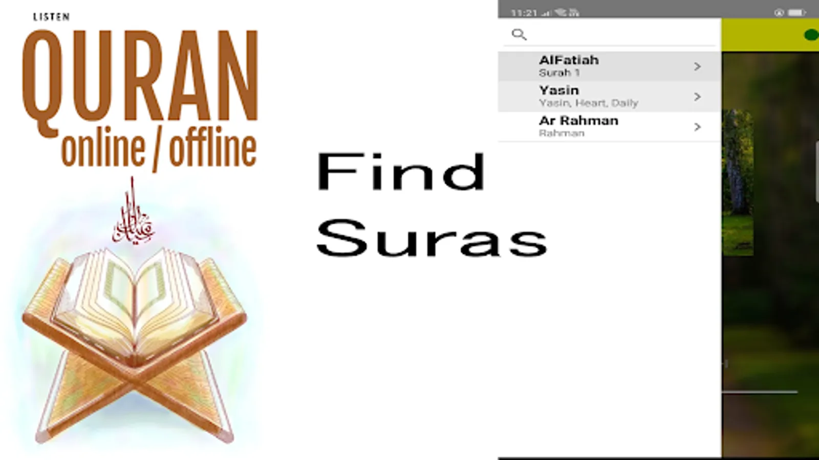 Listen to Quran Online. Just open the Quran and tap in the top left corner to find any surah of the Quran. Mp3 Quran suras file will be played and you can listen for a long time.