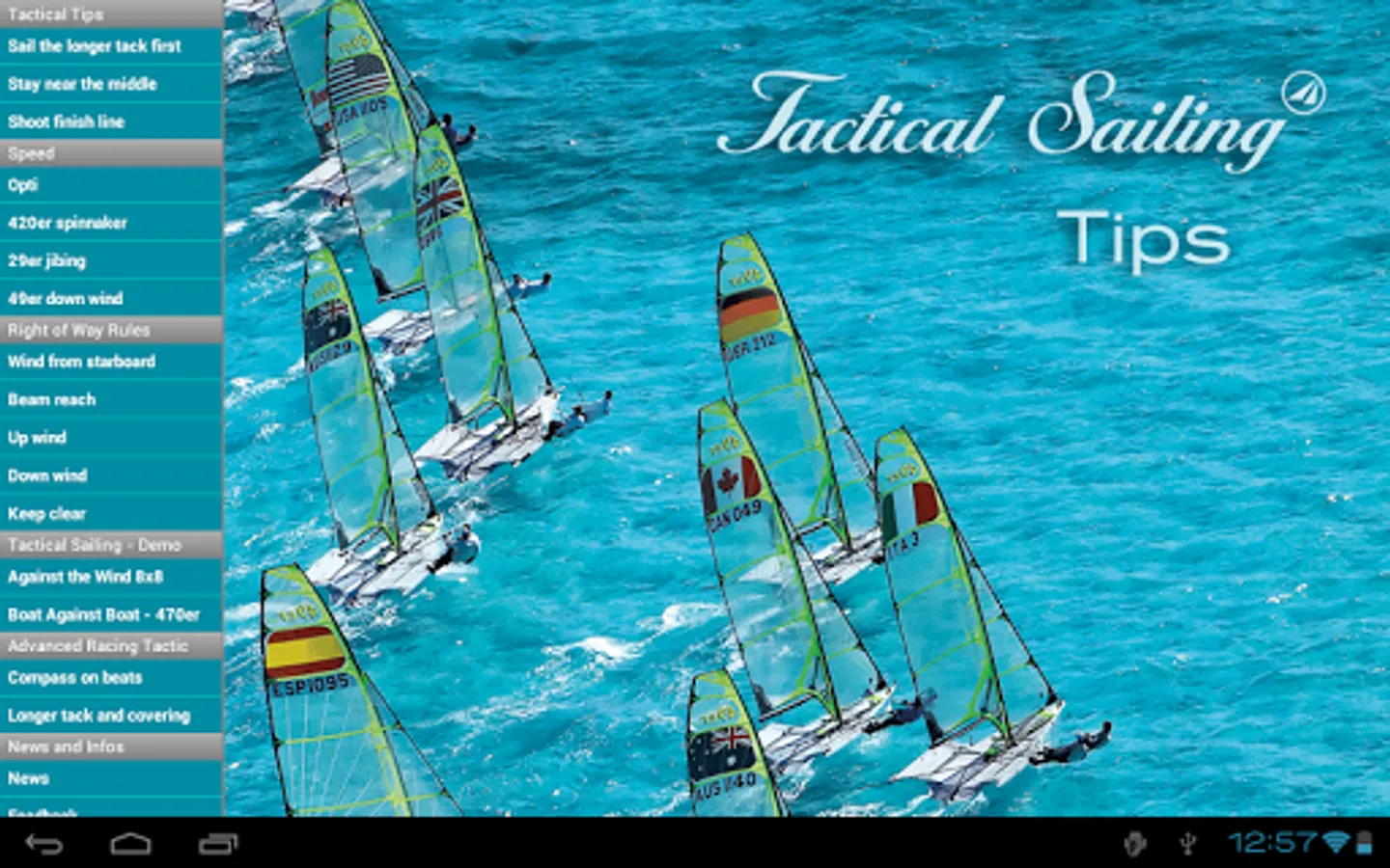 Three of the „Tactical Sailing” tips start to finish are with sound. The other 11 tips include: the rules of Right of Way (ISAF), advanced racing tips of boat speed ranges for dinghies, yachts and skiffs all presented in video clips. In 2012 these tips were awarded winner of the "European Award for Technology Supported Learning - Best Media Didactics!“