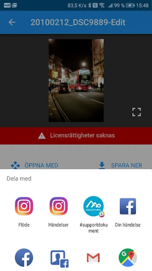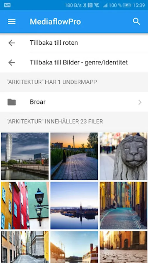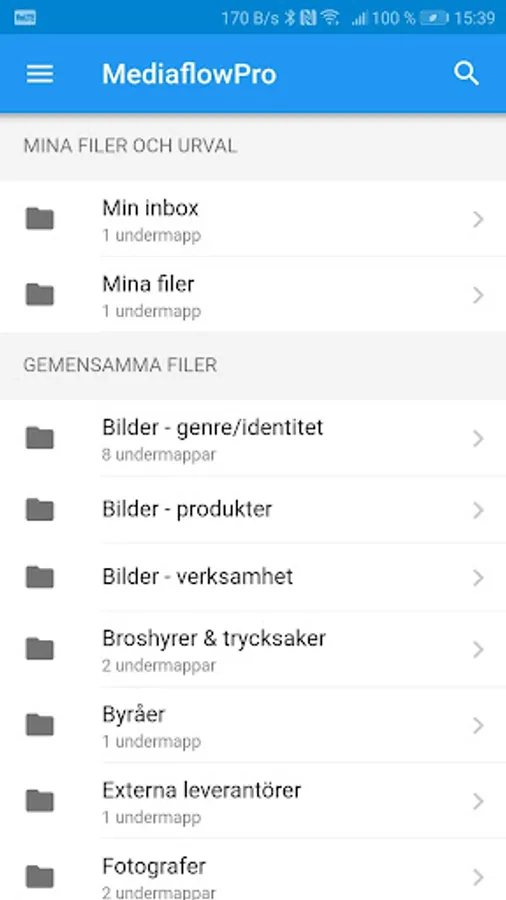 The app does not contain all the functionality found in the desktop variant, but basic functions to be able to browse folders, search files, see file information, rights, usage history, etc. and preview files (images, movies, PDF) directly in full screen. Take pictures with the phone / tablet and save the picture directly to any folder and be able to share files from other programs directly to Mediaflow.