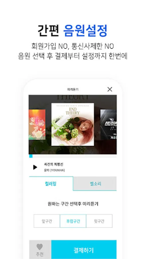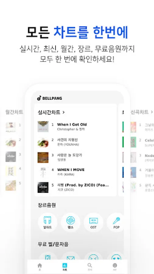 OST, POP, trot, ROOK, METAL, advertisement, CF, world music, J-POP, R&B, CCM, classical music, song, religious music, nursery rhymes, animations, and even free bell/text tones have been prepared with easy and convenient charts. Meet the top 100 on the chart