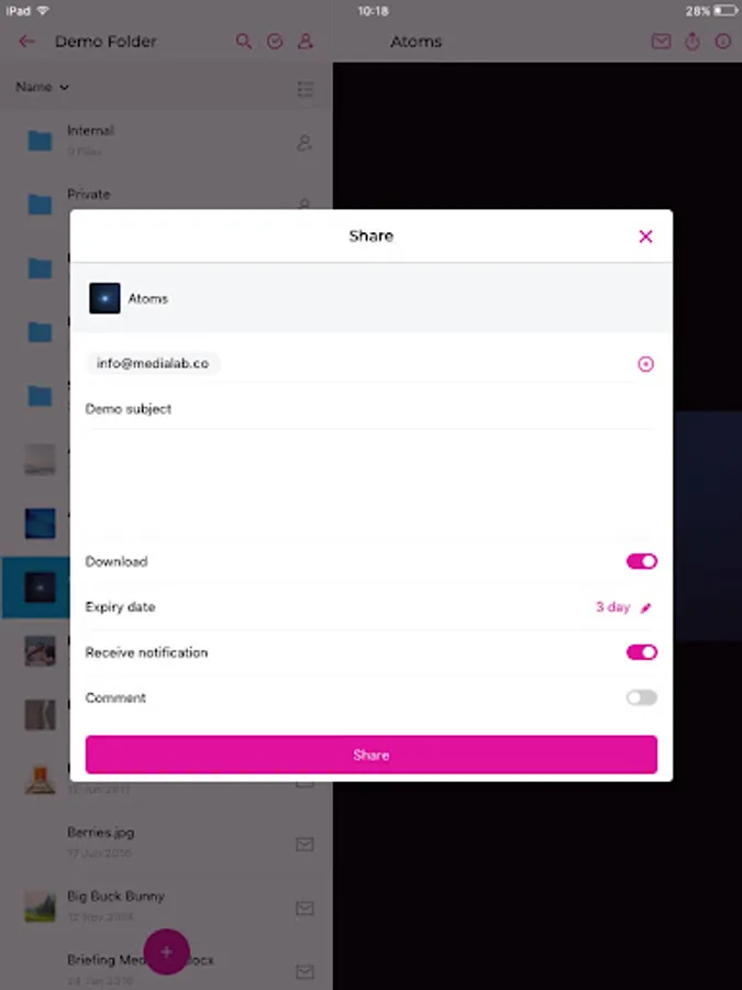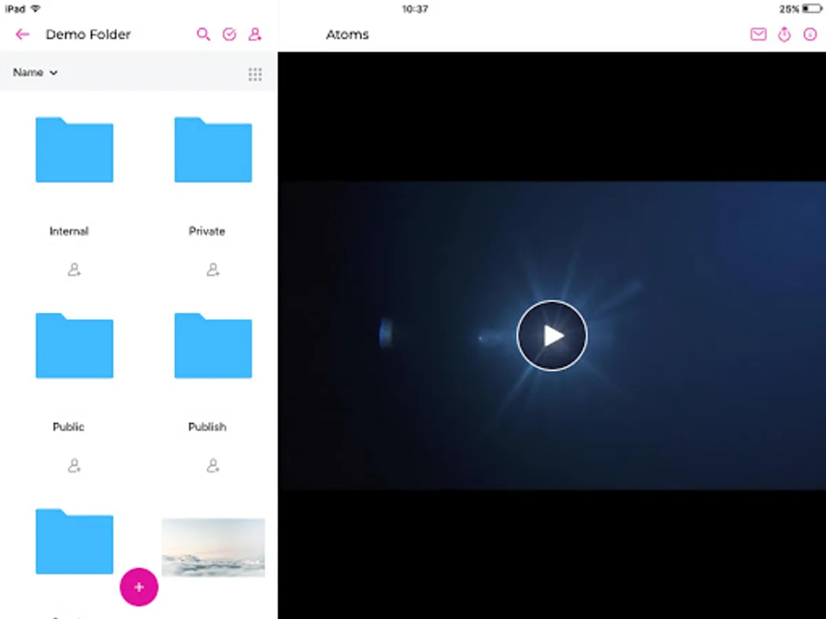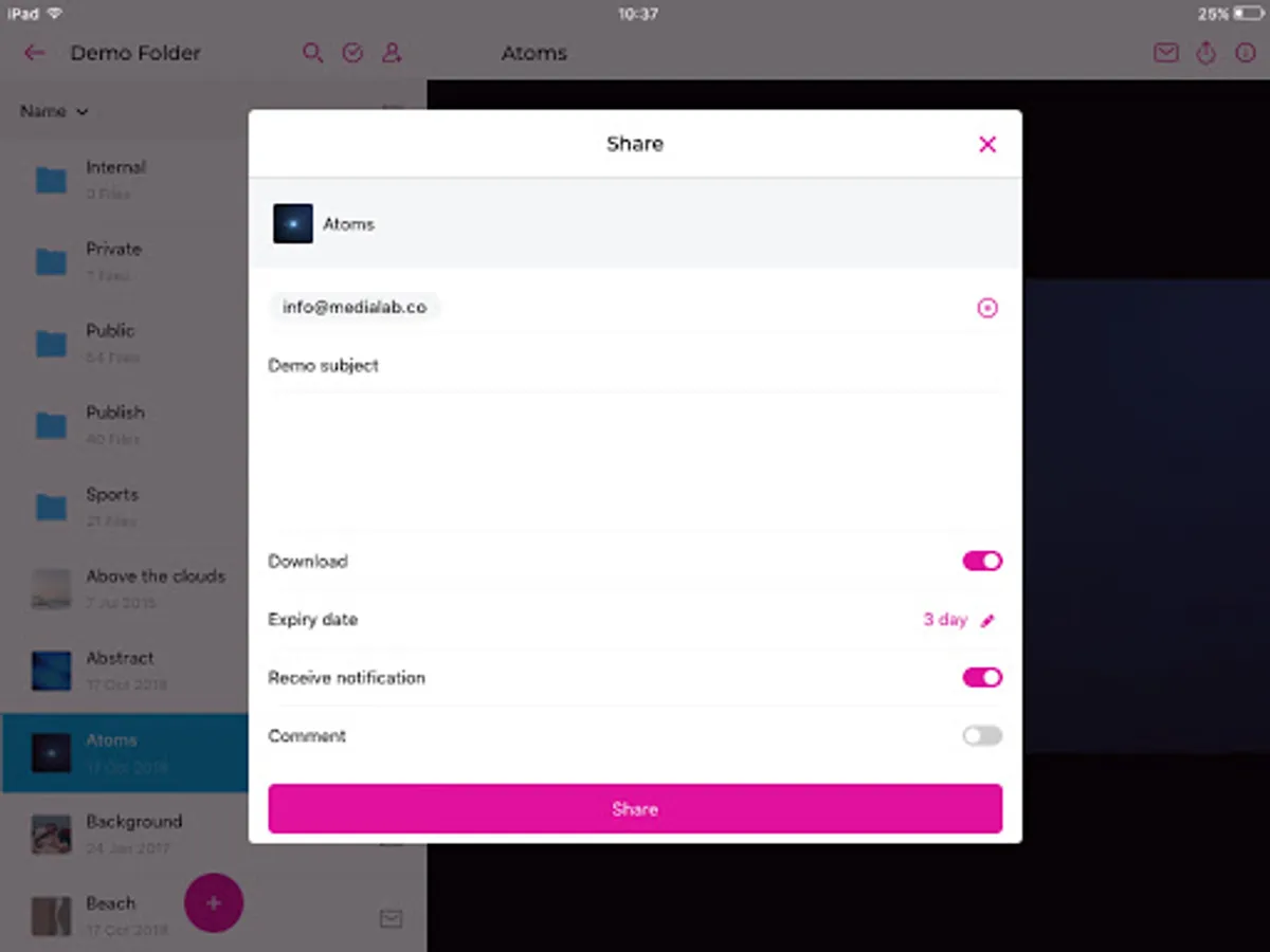 Since 2007 we provide a SaaS solution to share large media files on any device, safe and easy. With our professional tool you can upload, store and share large data files like video, photo and audio without any transfer limit and it’s cost effective. And with this app we enable you to do the exact same from the palm of your hand.