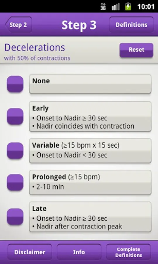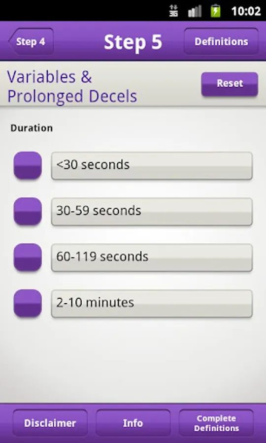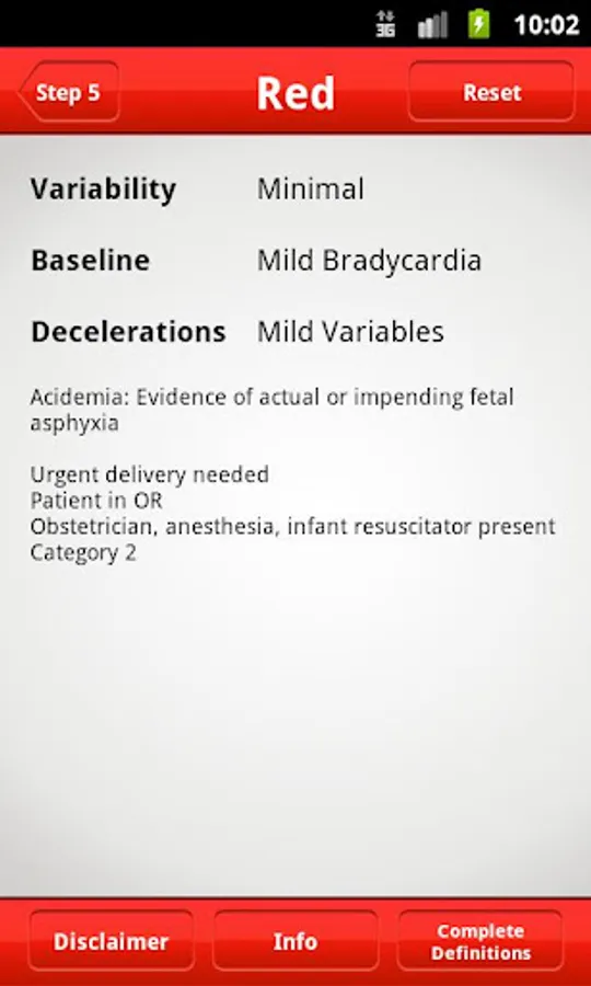 When using the FHR 5-tier app it is not necessary to refer to any other table or chart. Variability and baseline, and the shape, nadir, and duration of decelerations are entered with buttons on the consecutive screens. The app calculates the severity of the deceleration and the color for each tracing. All aspects of the tracing are summarized on the colored results screen, so that the user can quickly communicate with others.