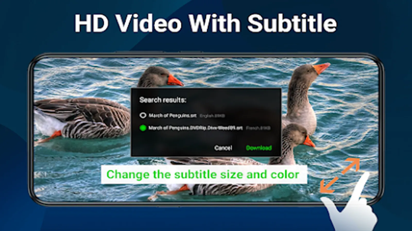- Subtitle gestures: Up and down to move text up and down. Change text size, background, shadow