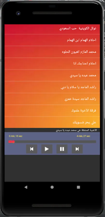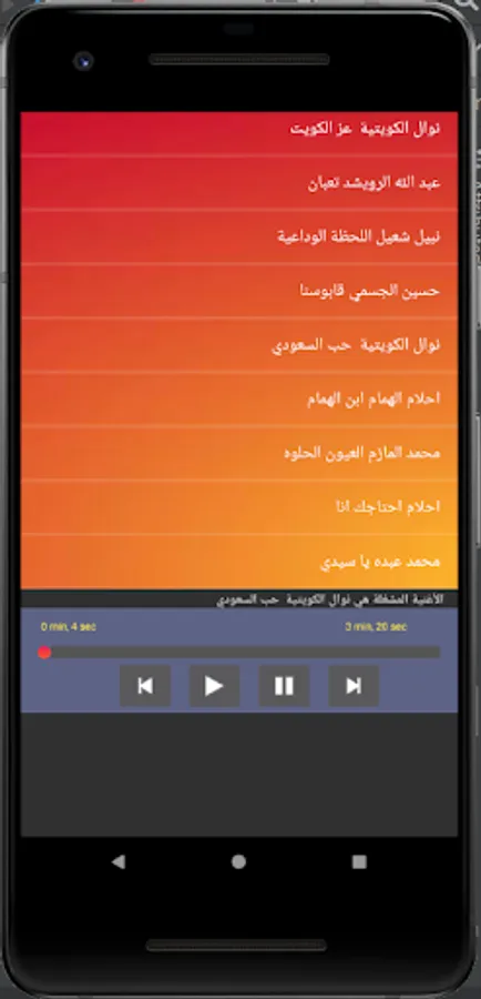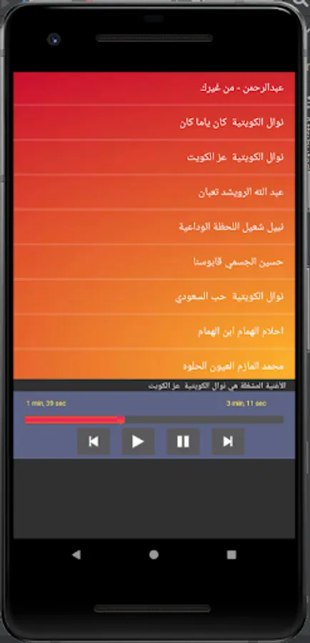 Ce programme contient une belle et élégante collection de chansons arabes des artistes arabes les plus brillants. Ces chansons peuvent être jouées sans avoir besoin d'Internet, et le ghanéen peut être joué en arrière-plan. C'est un excellent programme avec de bons ingrédients, un design et des couleurs attrayantes.