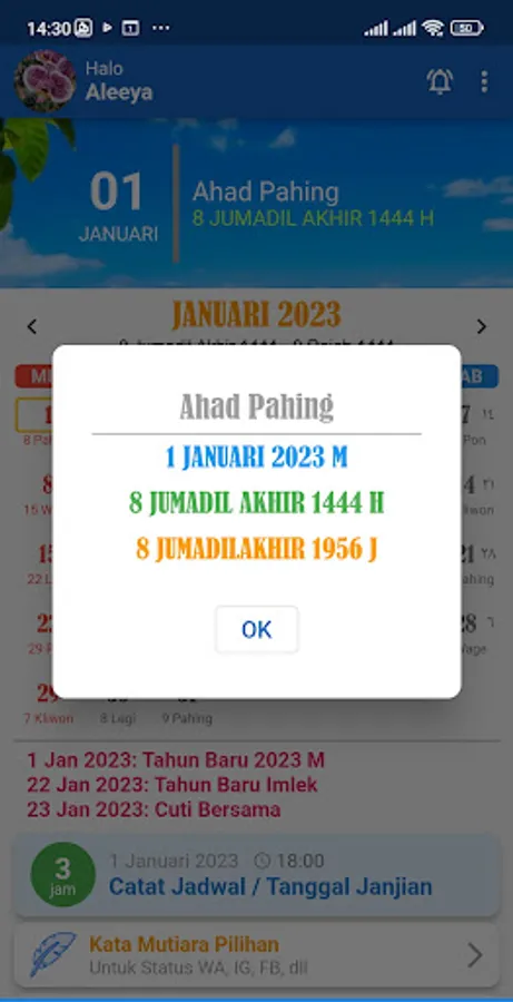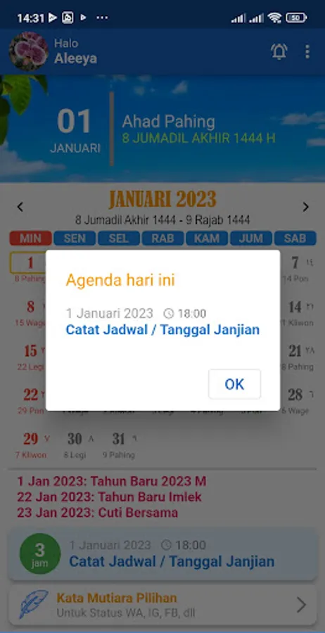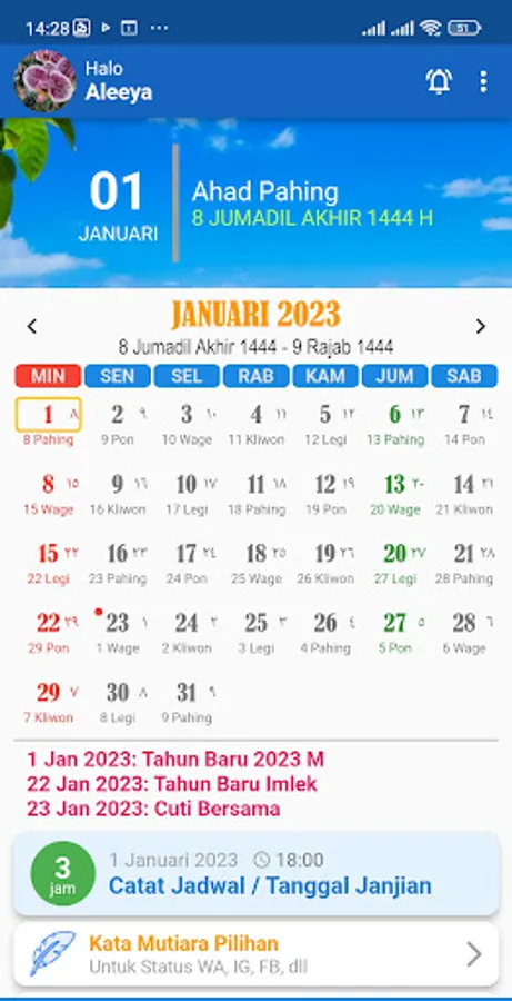 For those of you who like pearls of wisdom, we also provide a feature of motivational words that are updated every day. The motivational words in this calendar application are expected to refresh the mind and uplift the soul.
