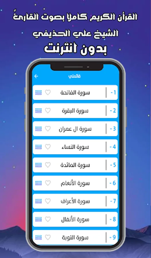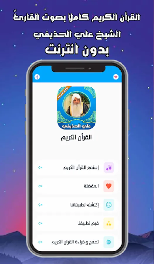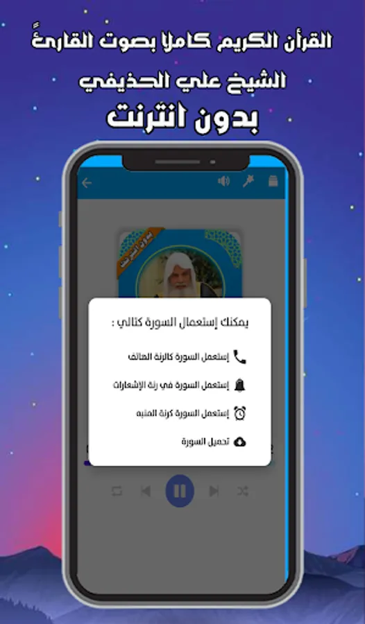 After downloading the complete Quran Ali Al-Hudhaifi application without the net, you can listen to the surahs of the Noble Qur’an with the voice of Sheikh Ali Al-Huthaifi for free, anytime, anywhere, with ease.