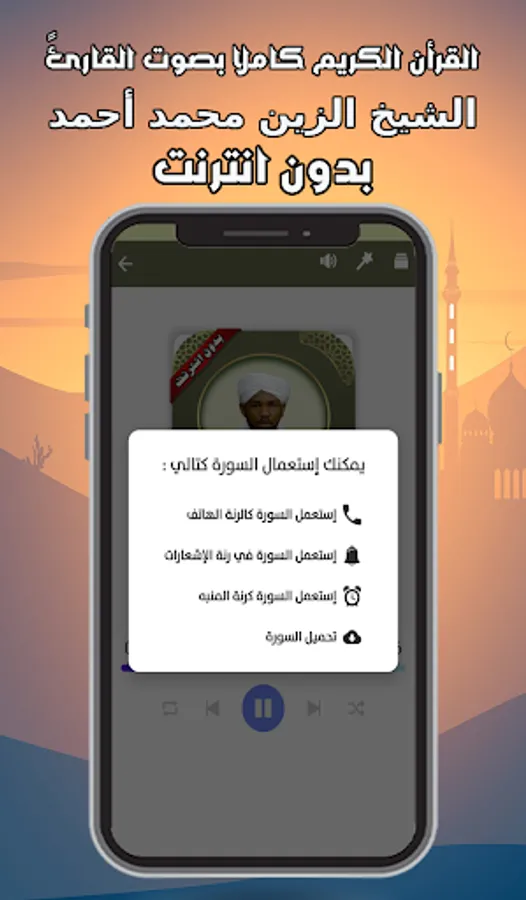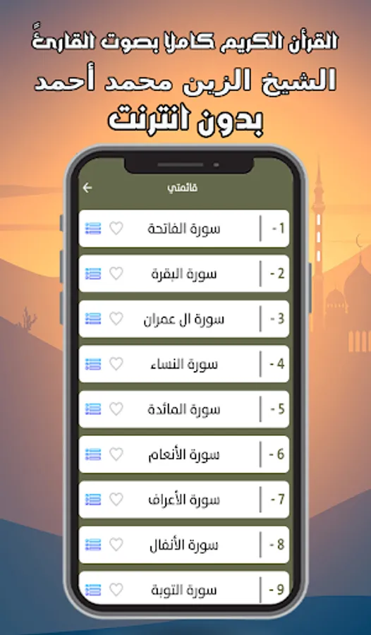 The application of the entire Qur’an of Al-Zain Muhammad Ahmad without the net enables you to listen to all the surahs of the Noble Qur’an after specifying the name of the surah that you want to listen to, with a fragrant recitation of Sheikh Al-Zain Muhammad Ahmad.