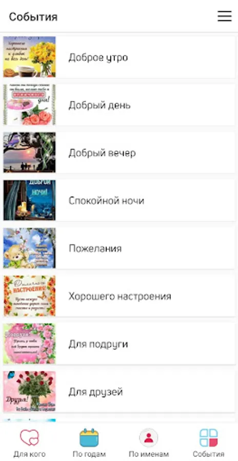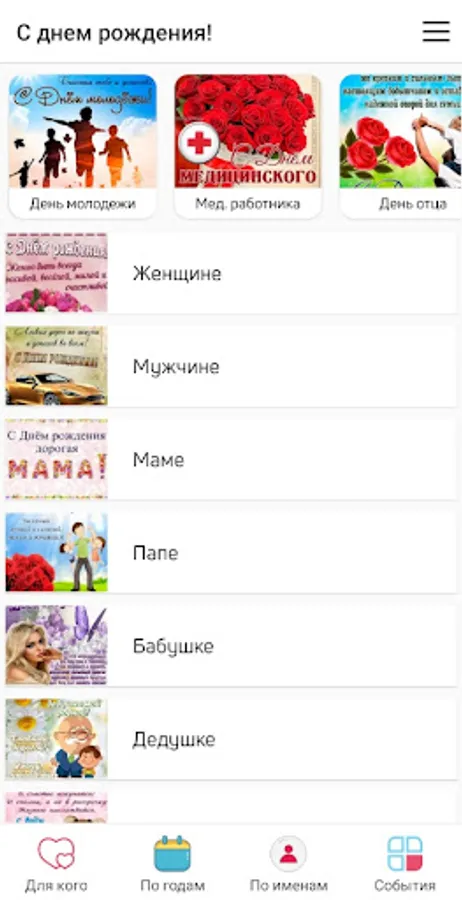 - Postcards by category (mom, dad, grandma, grandpa, lover, husband, woman, man, etc.)