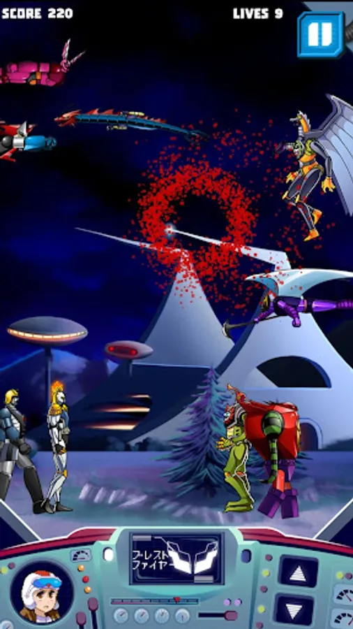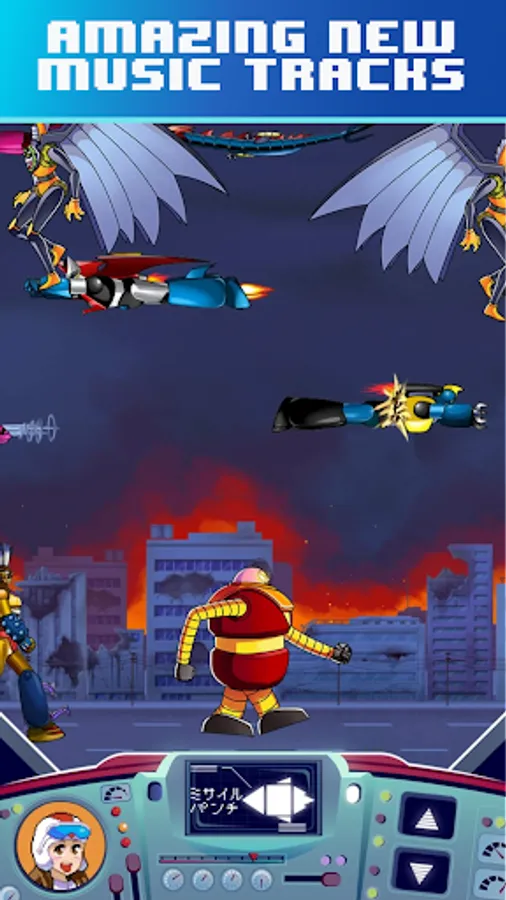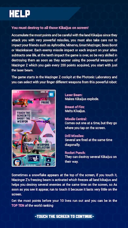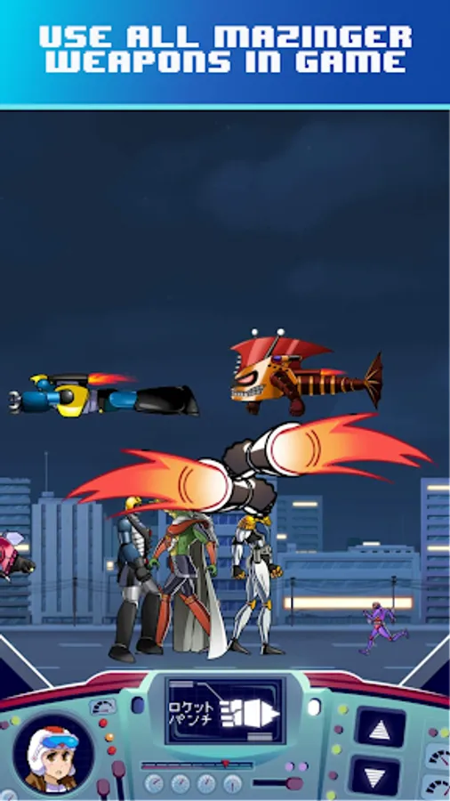 The game starts in the Mazinger Z cockpit at the Photonic Laboratory and you can select with your finger different weapons from this powerful robot: