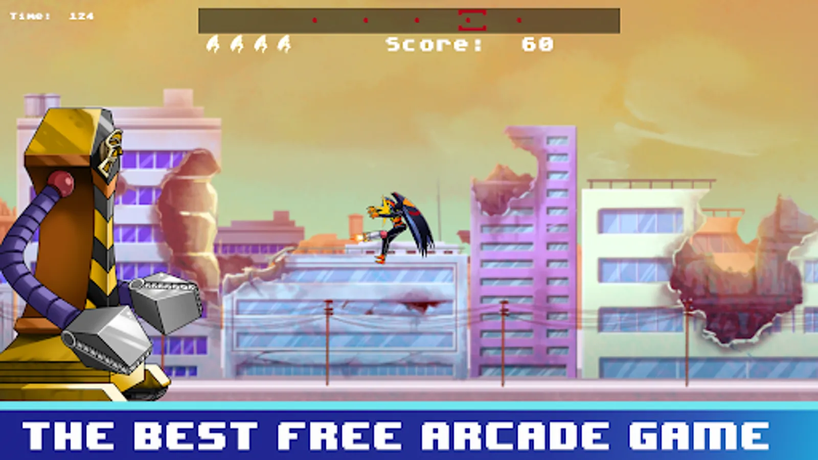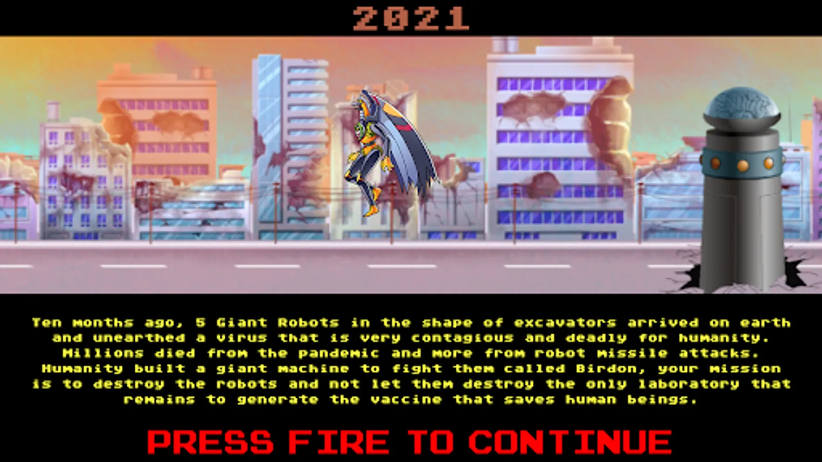 Ten months ago, 5 Giant Robots in the shape of excavators arrived on earth and unearthed a virus that is very contagious and deadly for humanity. Millions died from the pandemic and more from robot missile attacks. Humanity built a giant machine to fight them called Birdon, your mission is to destroy the robots and not let them destroy the only laboratory that remains to generate the vaccine that saves human beings.