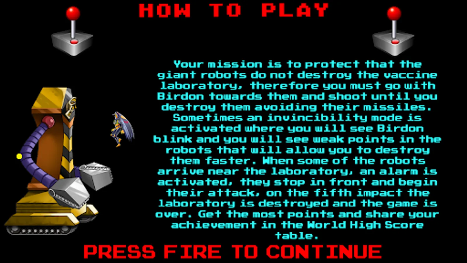 Your mission is to protect that the giant robots do not destroy the vaccine laboratory, therefore you must go with Birdon towards them and shoot until you destroy them avoiding their missiles. Sometimes an invincibility mode is activated where you will see Birdon blink and you will see weak points in the robots that will allow you to destroy them faster. When some of the robots arrive near the laboratory, an alarm is activated, they stop in front and begin their attack, on the fifth impact the laboratory is destroyed and the game is over. Get the most points and share your achievement in the world High Score table.