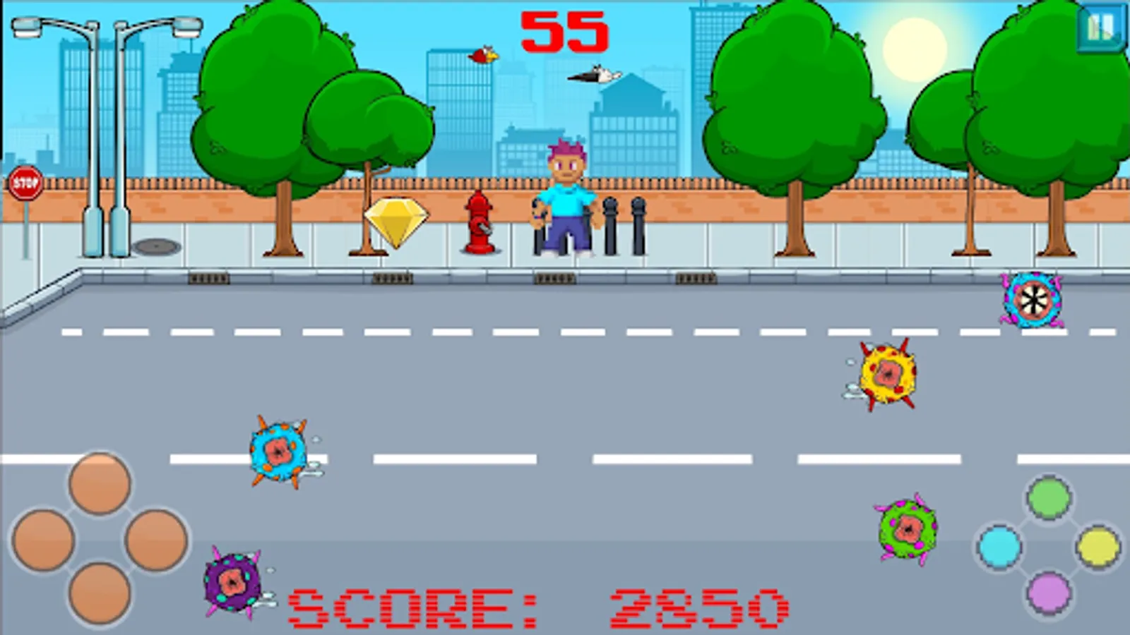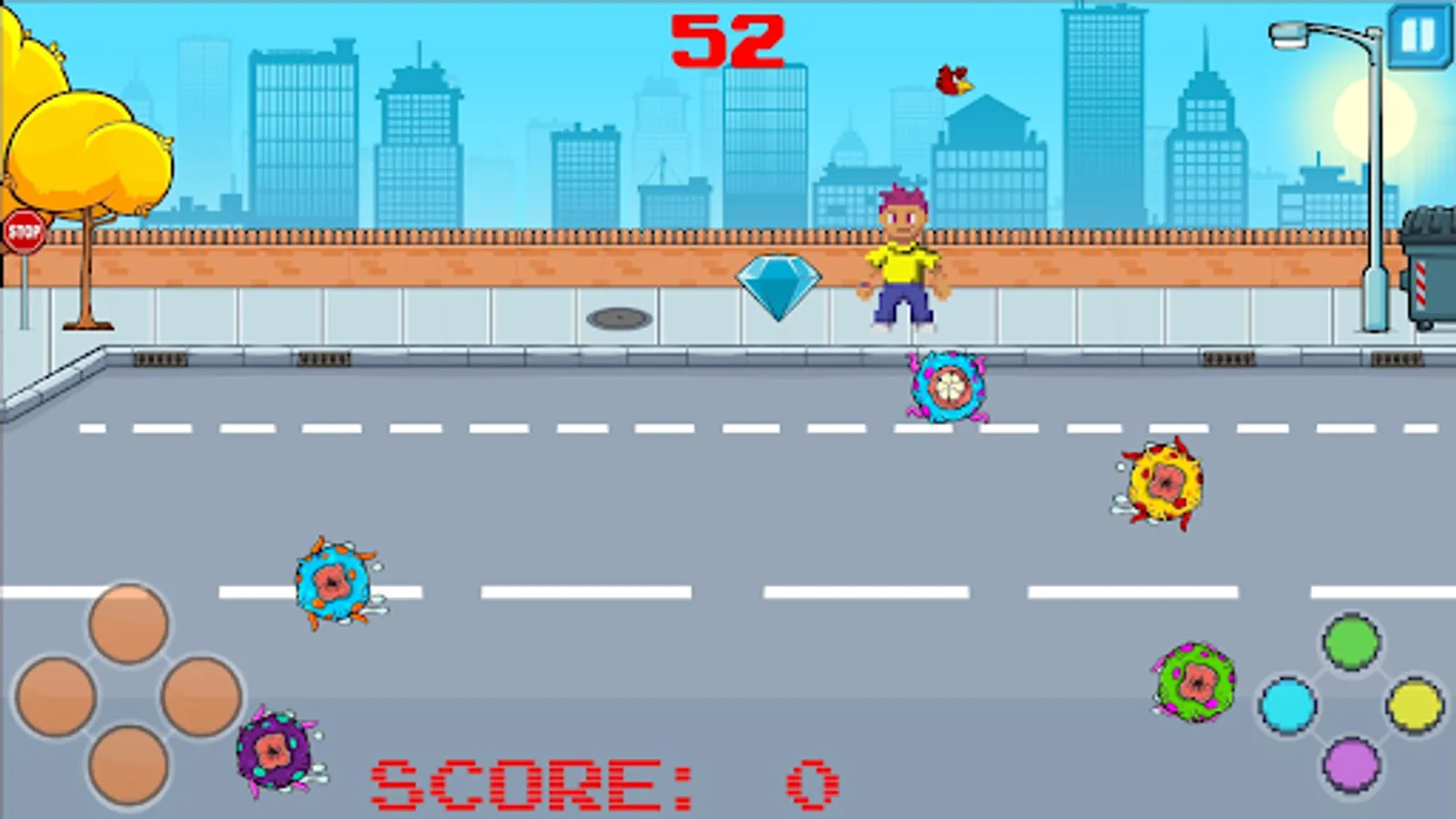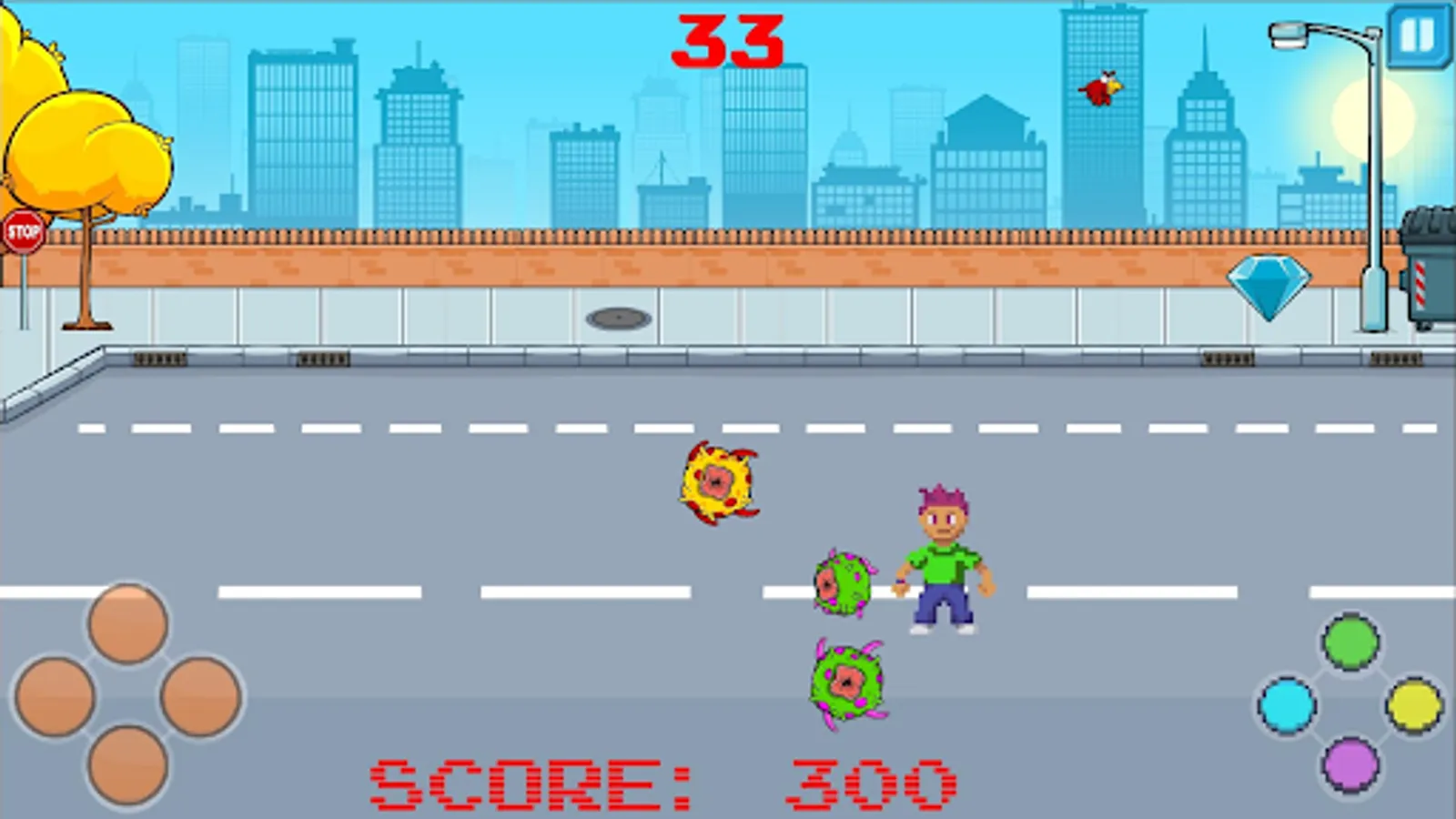 In the game there is a horde of enemies called Monstruovolos, which were peaceful animals that due to the lack of energy from the earth became monsters. Your mission is to fight them by transforming Umi with the corresponding color of each monster and hitting them so that they disappear from the city, for this you must use the joystick in each direction to move and by touching each color on the right side you achieve the transformation in the color necessary to fight each monster (Blue, Green, Yellow and Purple). You have 60 seconds to complete the screen and at the end of killing the enemies you must take the giant diamond that the city pays you to erase them from the map and be able to pass the level where new monsters appear, the speed of the enemies increases progressively screen by screen. In the end your objective is to see until which screen you reach and what score you achieve to enter the TOP 10 World using your ability.