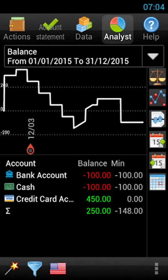 Download " Personal Finance Location " and " HandWallet " for free. Verify that your language, country and currency are correct. Hand Wallet will create 3 default accounts: cash, bank account and credit card. You can later change the names of these accounts by pressing the "Data" tab and then "Accounts", for example Bank of America, credit card visa or electronic wallet.
